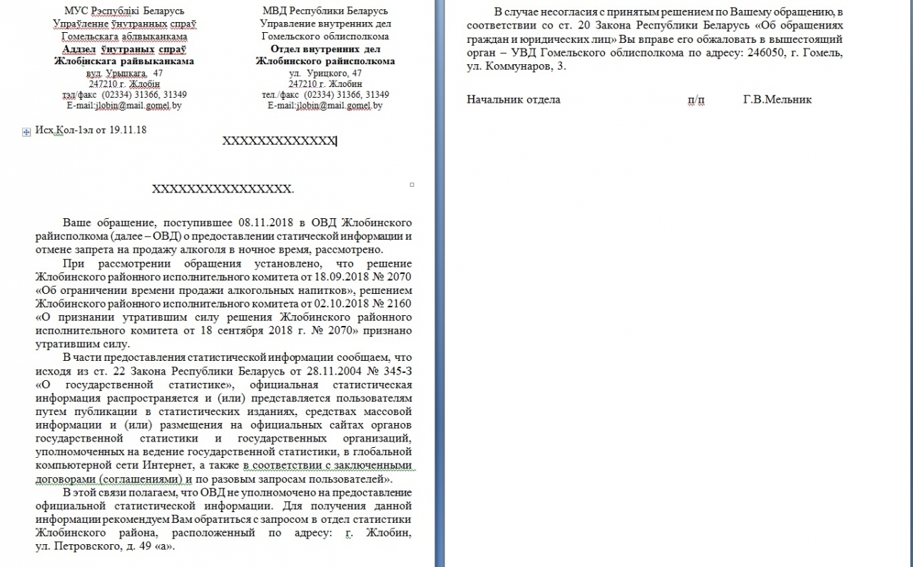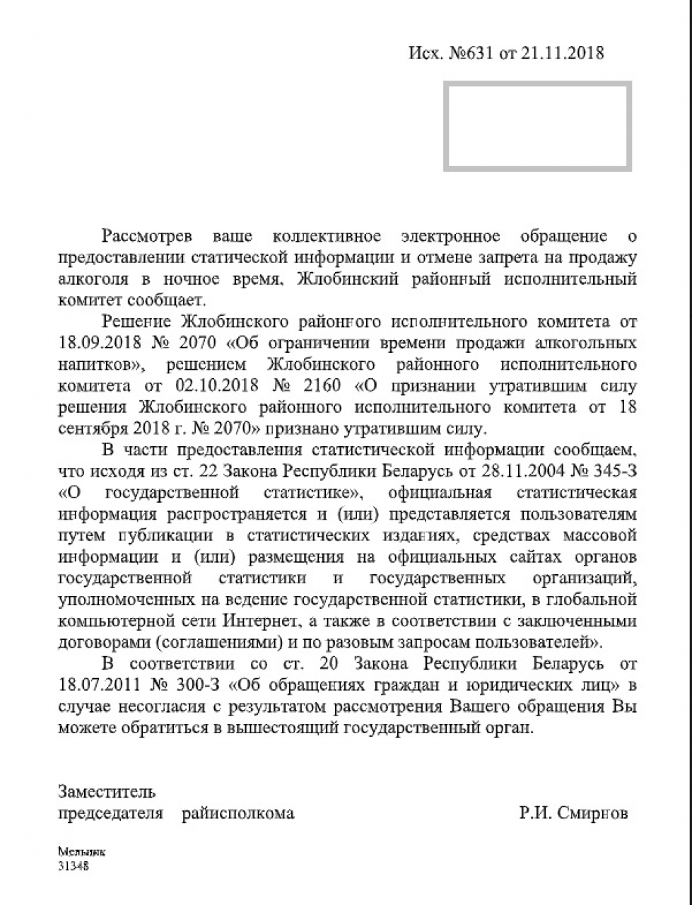 В Жлобинском районе Гомельской области 1 октября 2018 г. вступил в силу запрет на продажу алкоголя ночью. Алкогольные напитки и пиво теперь нельзя купить с 23:00 до 07:00. Запрет будет действовать до 30 сентября 2019 года.