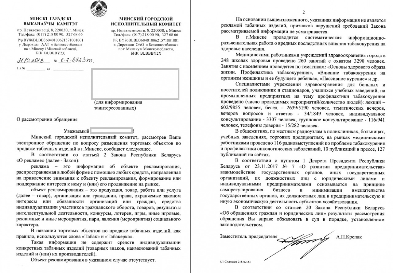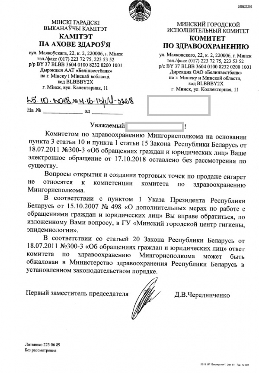 На основании ст. 41 Закона «О местном управлении и самоуправлении», которая устанавливает, что исполкомы обеспечивают оздоровление граждан, осуществляют контроль в области здравоохранения и в других областях, затрагивающих вопросы местного значения, просим вас рассмотреть этот вопрос, и решить его в пользу здорового образа нашего города, то есть принять меры, направленные на недопущение открытия вышеуказанных киосков на улицах города Минска.