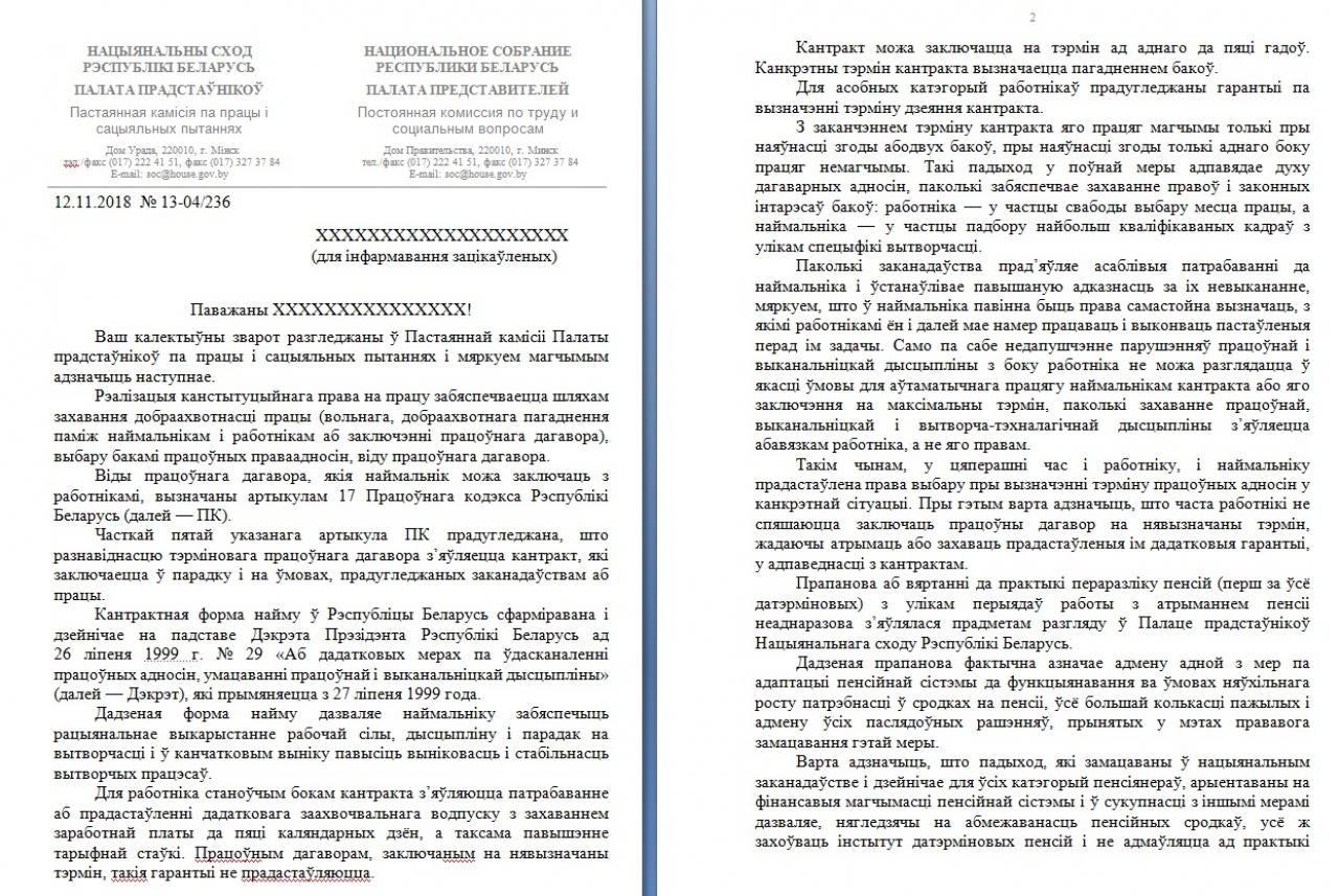 У першым чытанні Вы галасавалі за Закон аб імплементацыі дэкрэту №29 і дэкрэту №5 у Працоўны кодэкс Рэспублікі Беларусь, такім чынам зрабіўшы першы крок да ўзаконьвання прымусовай працы. Мы лічым, што з гэтымі нормамі Працоўны кодэкс нашай краіны стане адным з найгоршых: з-за татальнага распаўсюджвання кантрактнай формы найму, якая ператварылася ў разнастайнасць прымусовай працы, паколькі работнікі не маюць гарантыі працы пасля заканчэння кантракта, не могуць самастойна звольніцца без наступстваў. Незалежныя прафсаюзы яшчэ два гады таму выказалі сваю пазіцыю па дадзенаму пытанню, але безвынікова.