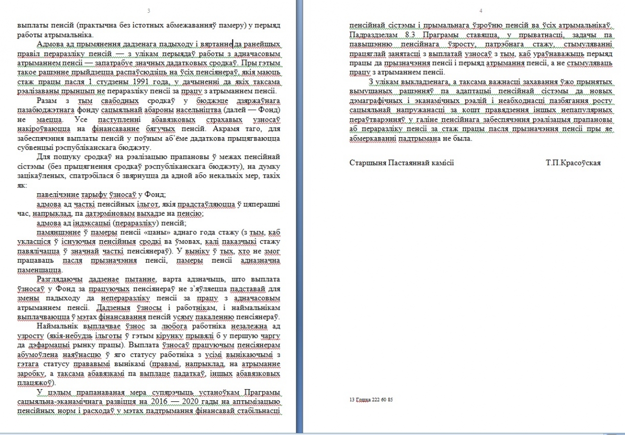 На наш погляд, гэтая норма не гуманная і не справядлівая. Паколькі, не ўлічваць стаж працы і не рабіць яе пералік пры дасягненні агульнаўстаноўленага пенсійнага ўзросту, калі чалавек, працягваючы працаваць, атрымлівае не поўную «ільготную» пенсію, проста з’яўляецца здзекам. Пры тым, што за гэты перыяд робяцца ўсе пералічэнні ў Фонд сацыяльнай абароны насельніцтва. Таму, на падставе вышэй сказанага і ў сувязі з павелічэннем пенсійнага ўзросту, просім Вас падтрымаць дадзеную прапанову і прагаласаваць за змену артыкула 66.