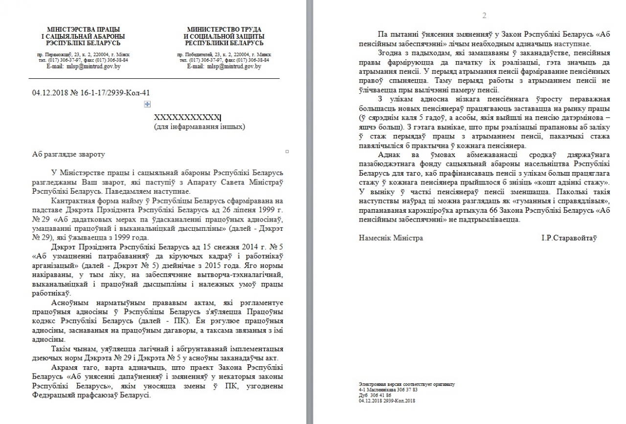 Па-другое. Звяртаемся да Вас з прапановай праявіць законатворчую ініцыятыву і вынесці на разгляд пытанне, якое тычыцца Закона «Аб пенсійным забеспячэнні», а дакладней змены артыкула 66: выкрэслівання ў ім словаў: «пры ўмове неатрымання пенсіі за гэты перыяд».