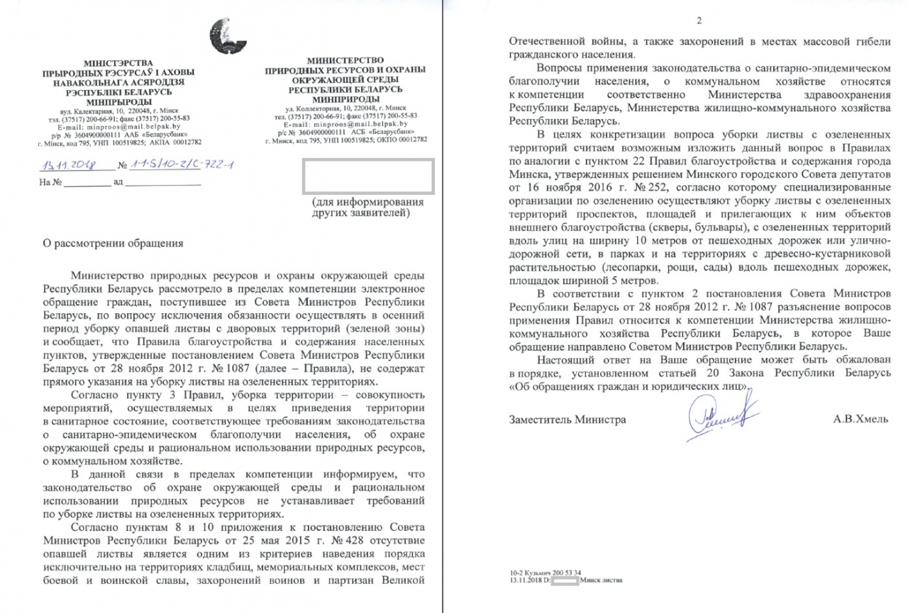 На основании изложенного просим исключить обязанность осуществлять в осенний период уборку опавшей листвы с дворовых территорий (зелёной зоны) путем внесения соответствующих изменений в Правила благоустройства и содержания населенных пунктов, утвержденные Постановлением Совета Министров Республики Беларусь от 28.11.2012 N 1087.