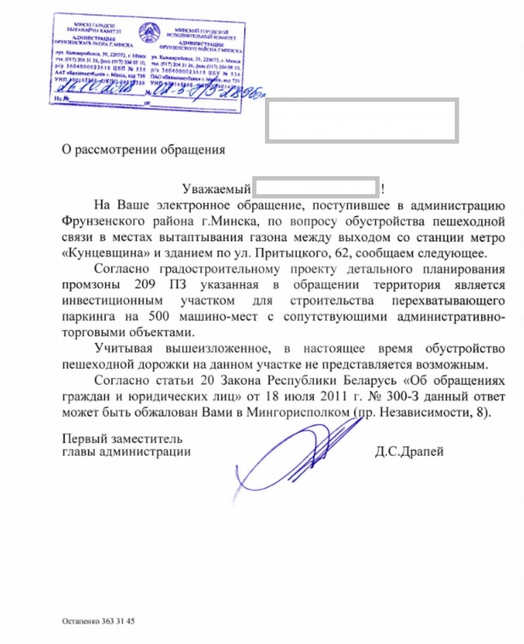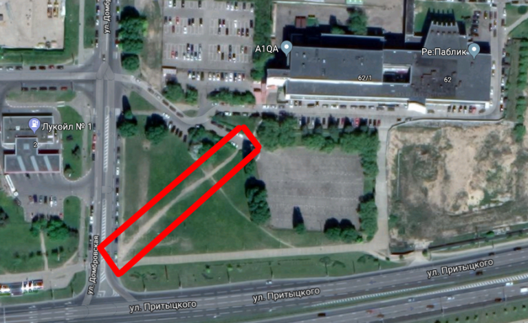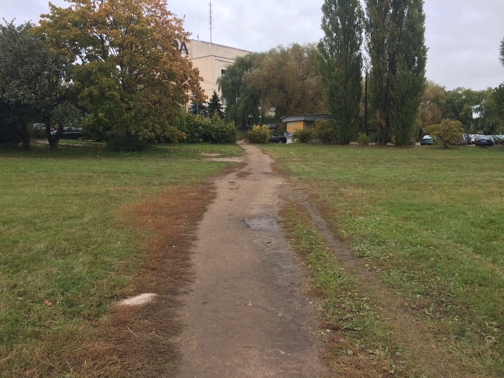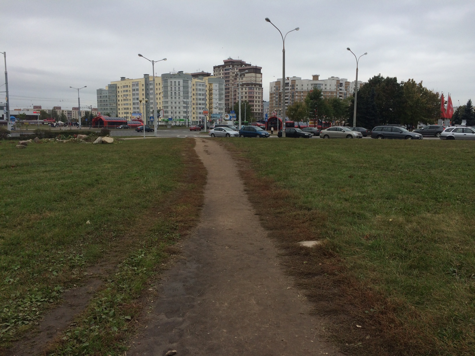 дать поручение специализированной организации по озеленению осуществить устройство твёрдого покрытия дорожки по пешеходным направлениям в местах вытаптывания газона между выходом со станции метро "Кунцевщина" и зданием по адресу Притыцкого, 62 (существующая в настоящее время тропинка - на фото),