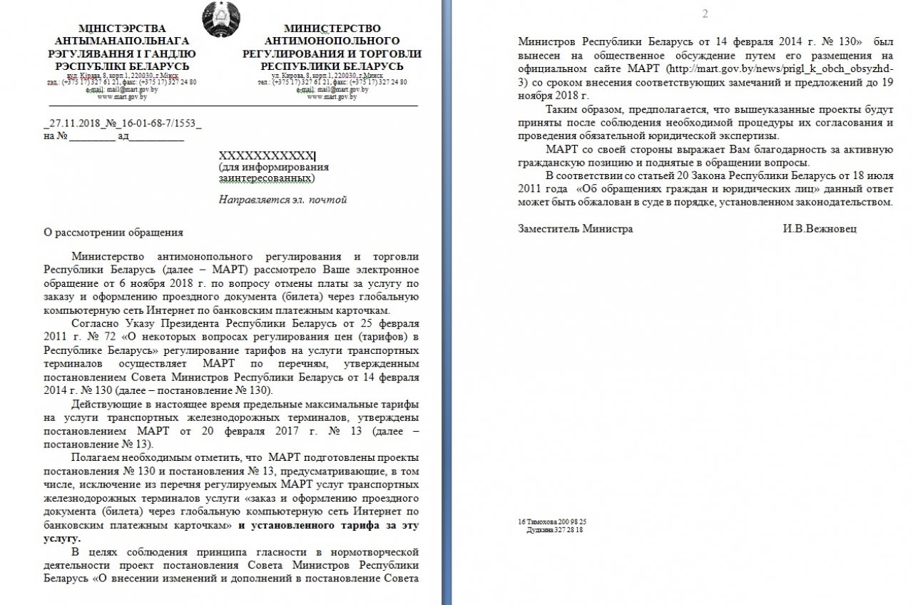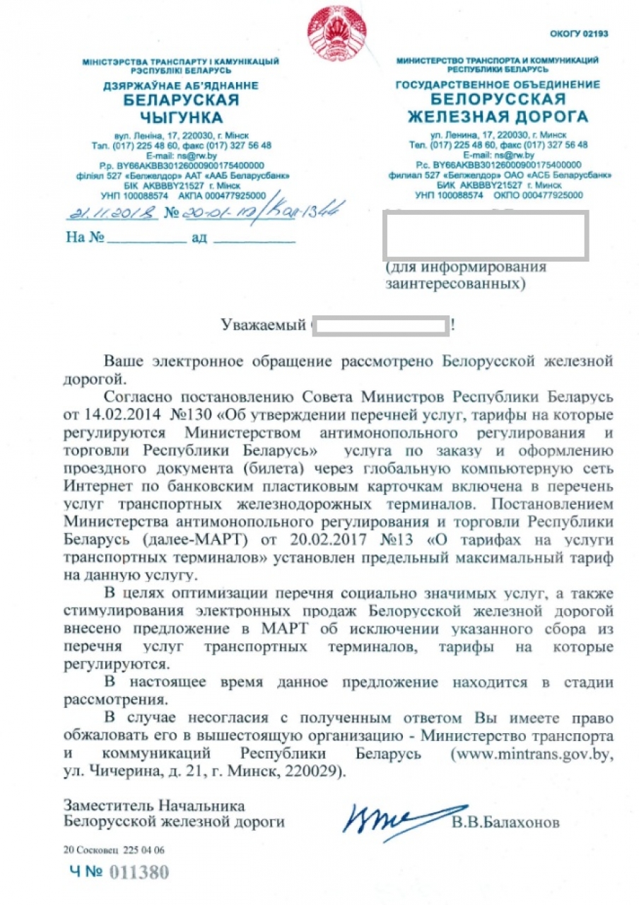 Считаем необоснованным тарифный сбор, когда пассажир без привлечения персонала БелЖД подобрал маршрут, оформил и оплатил билет!