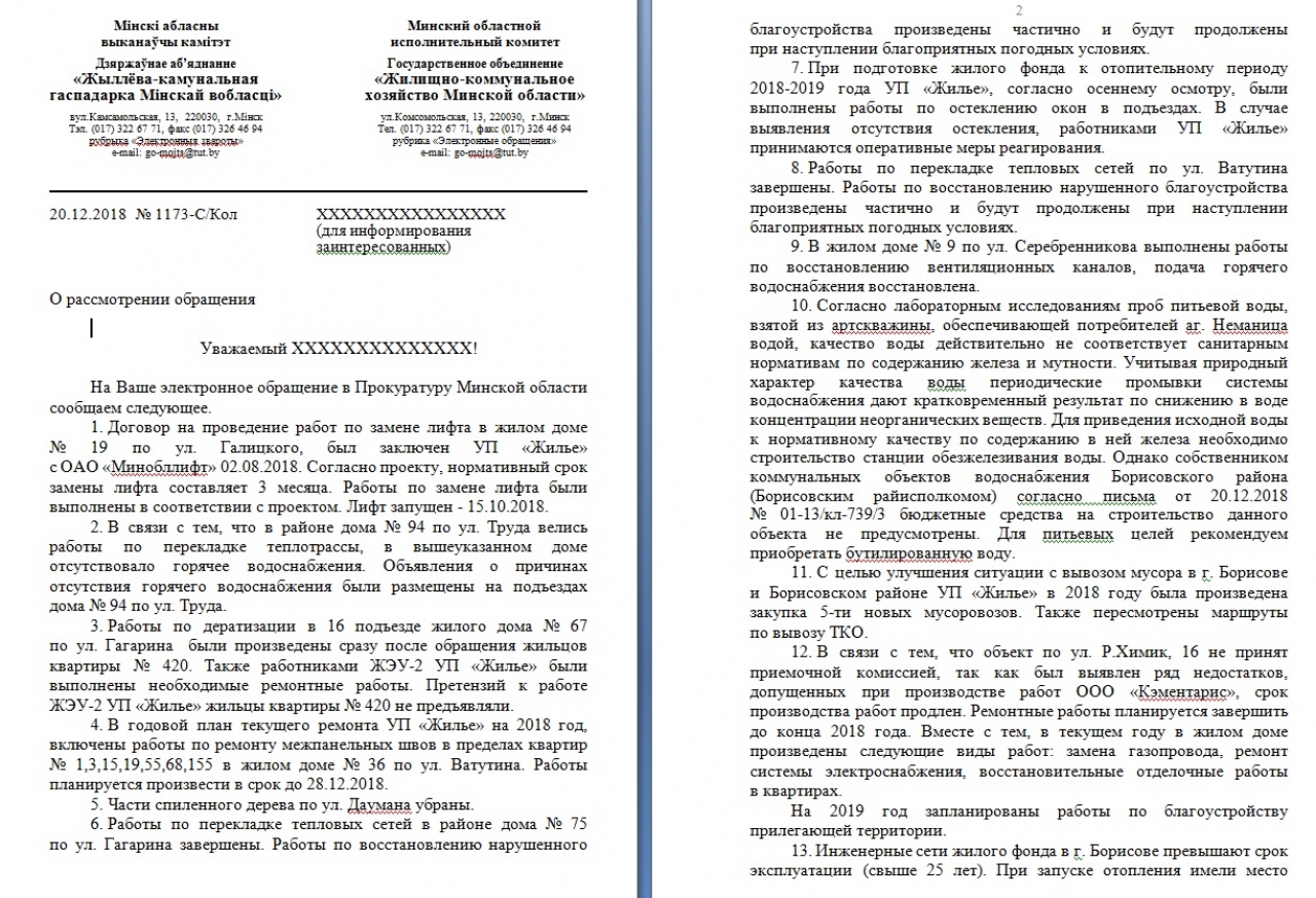 2) Провести тщательную проверку деятельности отдела жилищно-коммунального хозяйства Борисовского райисполкома на её соответствие законодательству Республики Беларусь, а также на наличие в ней фактов ненадлежащего оказания услуг. В случае выявления указанных фактов принять меры по привлечению виновных лиц к ответственности.