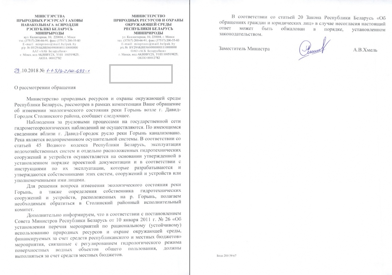 Основание: статья 41 Закона «О местном управлении и самоуправлении», которая устанавливает, что исполкомы принимают меры по обеспечению охраны окружающей среды и рациональному использованию природных ресурсов, а также подпункт 5.3 Положения о о Министерстве природных ресурсов и охраны окружающей среды Республики Беларусь, утвержденного постановлением Совета Министров Республики Беларусь от 20.06.2013 № 503, относящего к главным задачам Минприроды координацию деятельности других республиканских органов государственного управления, местных исполнительных и распорядительных органов, организаций в области обеспечения экологической безопасности, охраны окружающей среды и рационального использования природных ресурсов, в том числе рационального использования и охраны водных ресурсов.