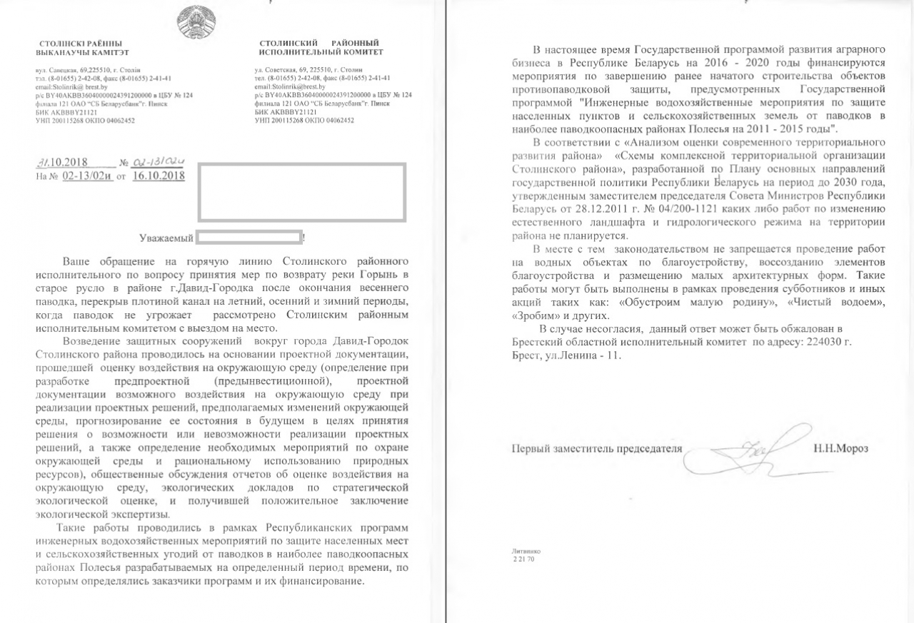 принять меры по возврату реки Горынь в старое русло в районе г. Давид-Городка после окончания весеннего паводка, перекрыв плотиной обходной канал на летний, осенний и зимний период, когда паводок не угрожает. Затем в таком ритме продолжать осуществлять функционирование обходного канала.