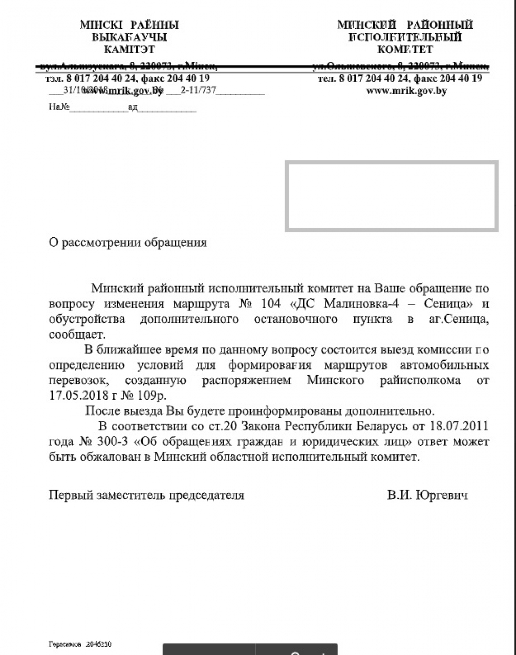 1. Введение нового маршрута городского общественного транспорта, который по территории а.г. Сеница будет двигаться по прежнему маршруту автобуса № 104: «Набережная» - «Сеницкая церковь» - «Тополиная» - «Сеница» и далее в какую-либо точку в г. Минске, в том числе и по ул. Кижеватова и далее.
