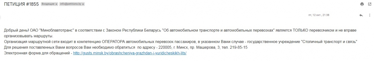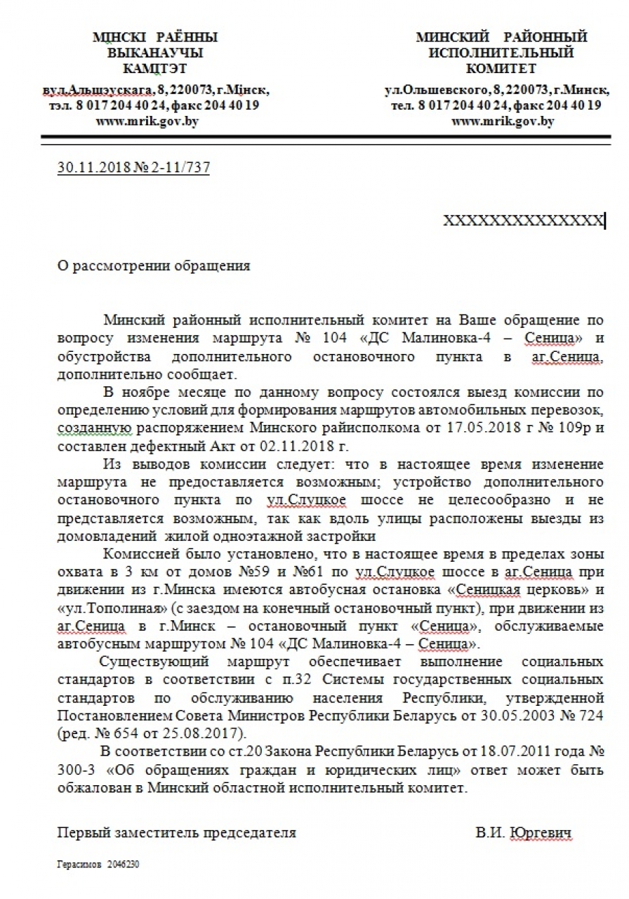 2. Разместить остановочный пункт городского общественного транспорта в максимально возможной близости к перекрестку ул. Слуцкое шоссе и ул. Зеленая, в результате чего значительно возросла бы безопасность и удобство жителей указанных домов и домов, находящихся в этом районе.
