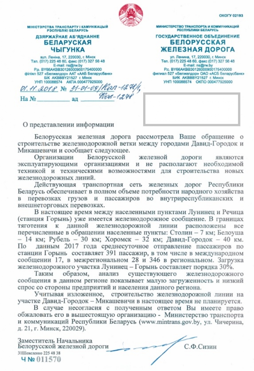 Просьба к вышестоящим организациям поддержать данный проект и способствовать его воплощению в жизнь, посредством принятия мер по строительству железнодорожной ветки, соединяющей г. Давид-Городок и г.Микашевичи Брестской области