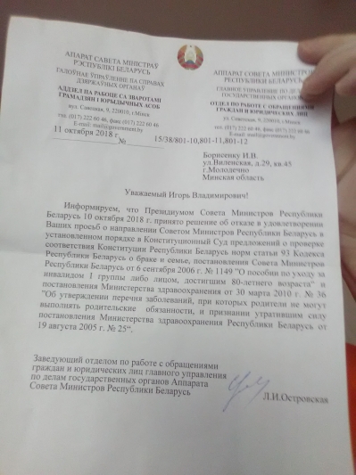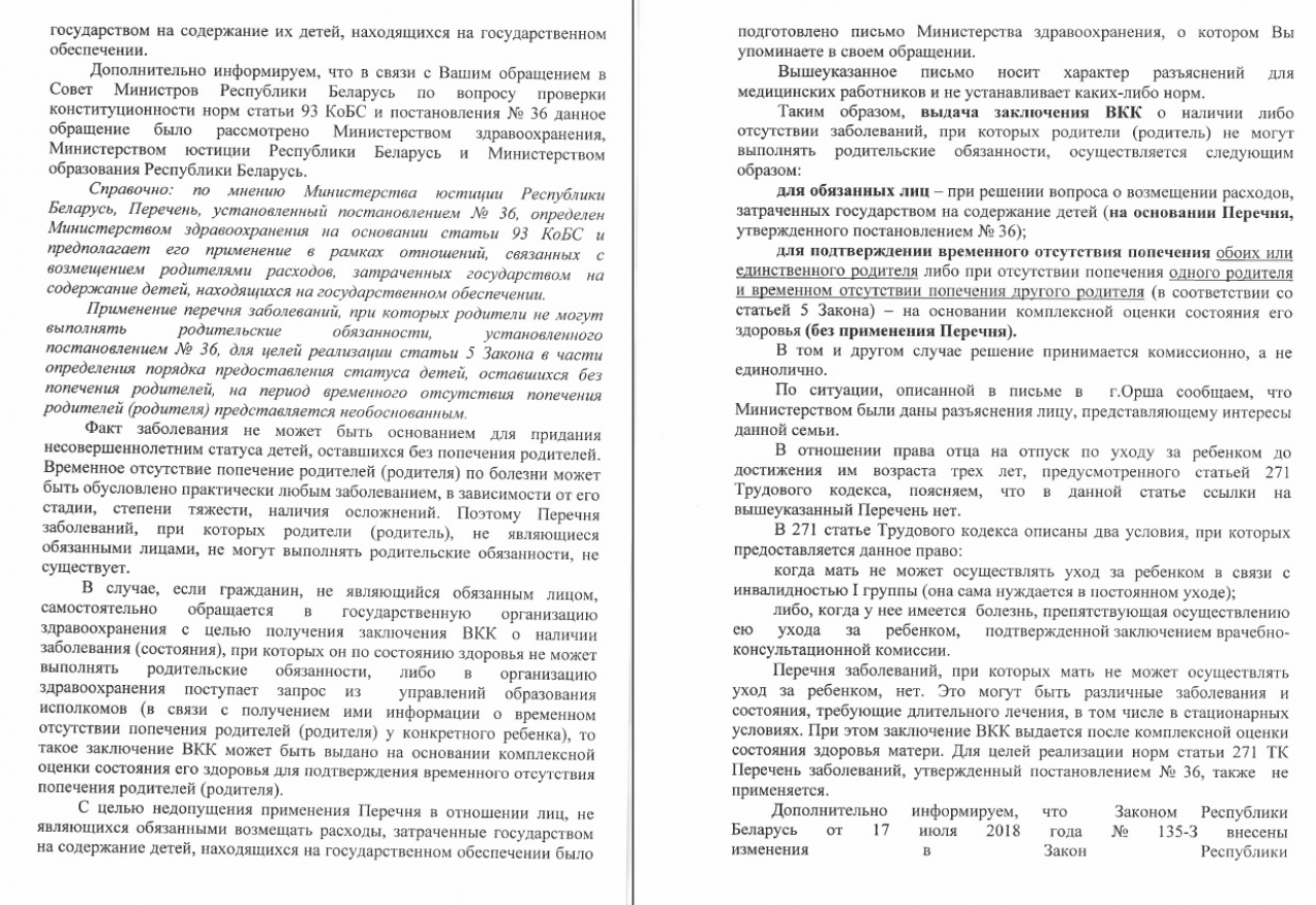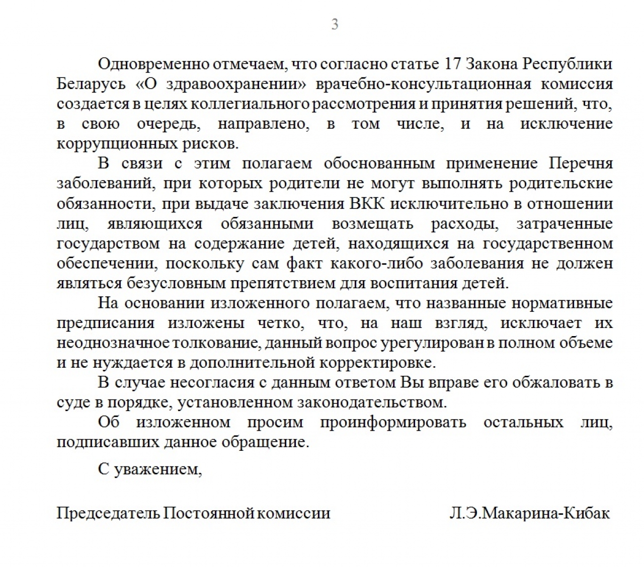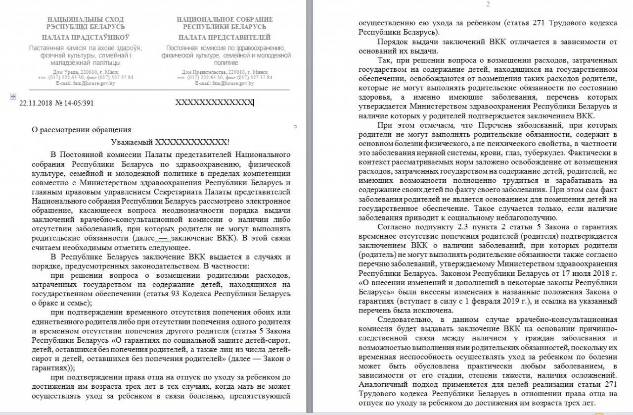 2. Что есть на практике. В 2015 г. выходит письмо Министерства Здравоохранения, подписанное Пиневичем (замминистра) . В этом письме смешаны все нормы Закона. . Более того, первая часть письма противоречит второй. Тут же указано, что оказывается заключения ВКК, о наличии или отсутствии заболеваний, при которых родители не могут выполнять родительские обязанности при обращении за ними гражданам не выдаются. По мнению Министерства Здравоохранения, такое заключение может получить лишь лицо, у которого отобраны дети. Где в законодательстве есть ссылка на то, что за заключением может обратиться лишь лицо, у которого отобраны дети, никто не указывает. Минздрав довольствуется лишь тем, что в преамбуле перечня заболеваний указано, что разработан в соответствии с частью 4 ст.93 КоБС. Эта статья просто уполномочивает Министерство здравоохранения перечень разработать. Тем не менее, Минздрав в письме строго запрещает выдавать гражданам такие заключения ВКК, до того момента, пока не отберут у родителей детей. Получается, государство предусмотрело механизм ( ну допустим в целях защиты детей ) при определенных заболеваниях у родителей, брать на себя обязанности по содержанию и воспитанию детей, не лишая родительских прав. Минздрав же, своим письмом установил "норму" о том, что следует скрывать о заболевании родителей до того момента, пока не отберут детей. А потом выдавать заключения ВКК, чтобы тех кто болен освободить от возмещения государственных расходов. И тут вырисовывается вот что. Если в семье больные родители и родители это не скрывают, а желают получить определенную помощь в виде сопровождения семьи, то им отказано в помощи, так как нет документа, подтверждающего болезнь родителей. Так, в Орше, мама имеет лёгкую умственную отсталость. Согласно международной классификации болезней ее умственное развитие соответствует возрасту 9-12 лет и это предел. Однажды семья уже не справилась с бытовой ситуацией ( так как медики скрывали информацию о заболевании матери и не выдавали соответствующего документа) и у семьи отобрали троих детей. Отца лишили родительских прав, мать (больную) нет. Сейчас у них родился ещё ребенок и умственно отсталая мать просит, чтобы по уходу за ребенком в декретный отпуск был оформлен отец ребенка. Для этого ей нужно заключение ВКК. Ей отвечают: по отношению к старшим отобранным детям вы имеете заболевание, по отношению к младшей - вы здоровы. Когда отберем младшую дочь, тогда дадим заключение ВКК. Маме неоднократно отказывали в выдаче запрашиваемых заключений ВКК, или выдавали совсем не то, что она запрашивала. Поскольку отказ в совершении административной процедуры - административно наказуемое деяние, семья обратилась в КГК. Заведующего поликлиники привлекли к административной ответственности. Однако ситуация до сих пор не разрешена. До сих пор все ответы идут по ссылкам на письмо Минздрава, которым запрещено выдавать гражданам заключения ВКК о наличии или отсутствии у них заболеваний, при которых родители не могут выполнять родительские обязанности. В данном случае нарушена, и административная процедура, и конституционное право гражданина на получение в отношении себя любой информации. Тут нарушение и прав детей. Скрывая информацию о заболевании родителей, медики способствуют тому, что семье не будет своевреме