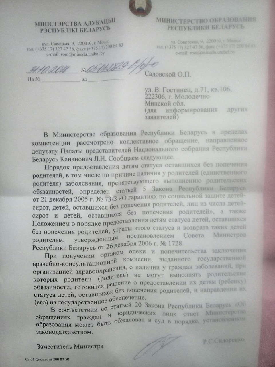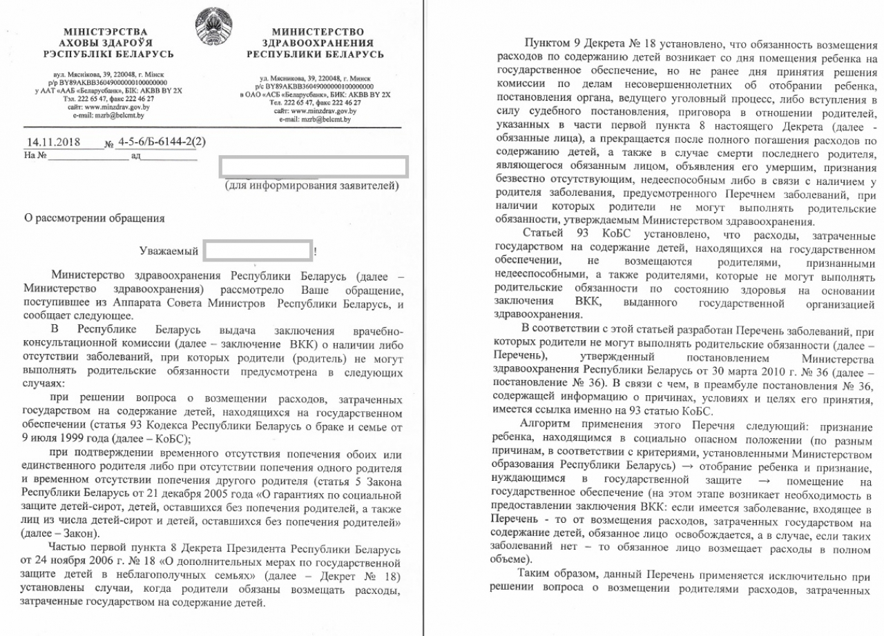 Ответ Министерства здравоохранения не мотивирован, и противоречит Законодательству Республики Беларусь, и ответу Министерства образования.