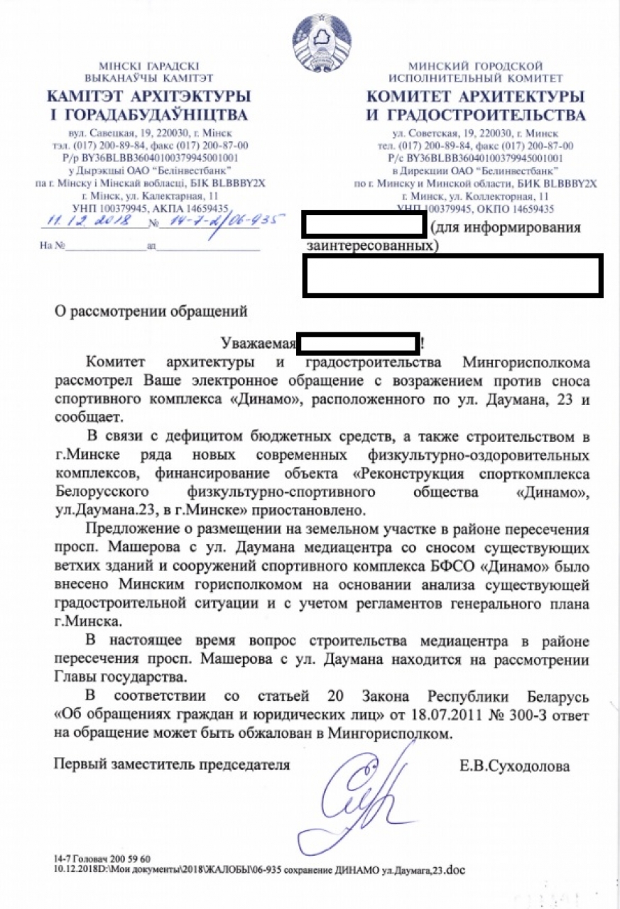 В связи с этим и на основании ст. 41 Закона «О местном управлении и самоуправлении», которая устанавливает, что исполкомы обеспечивают разработку градостроительных проектов, решают вопросы размещения объектов строительства на соответствующей территории, просим Вас не сносить спортивный комплекс "Динамо", а принять меры, направленные на его реконструкцию.