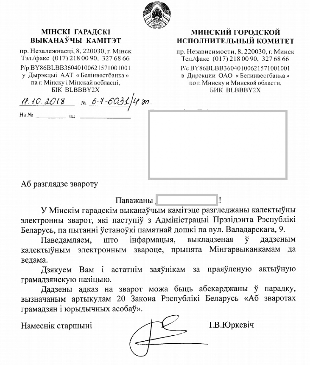 Але адказ не ўтрымлівае звестак аб мерах, прынятых Мiнгарвыканкамам па пытанню ўсталявання памятнай шыльды, прысвечанай 100-годдзю БНР па адрасе г. Мінск, вул. Валадарскага, д. 9, якое змяшчалася ў папярэднем звароце.