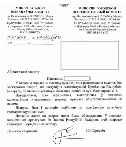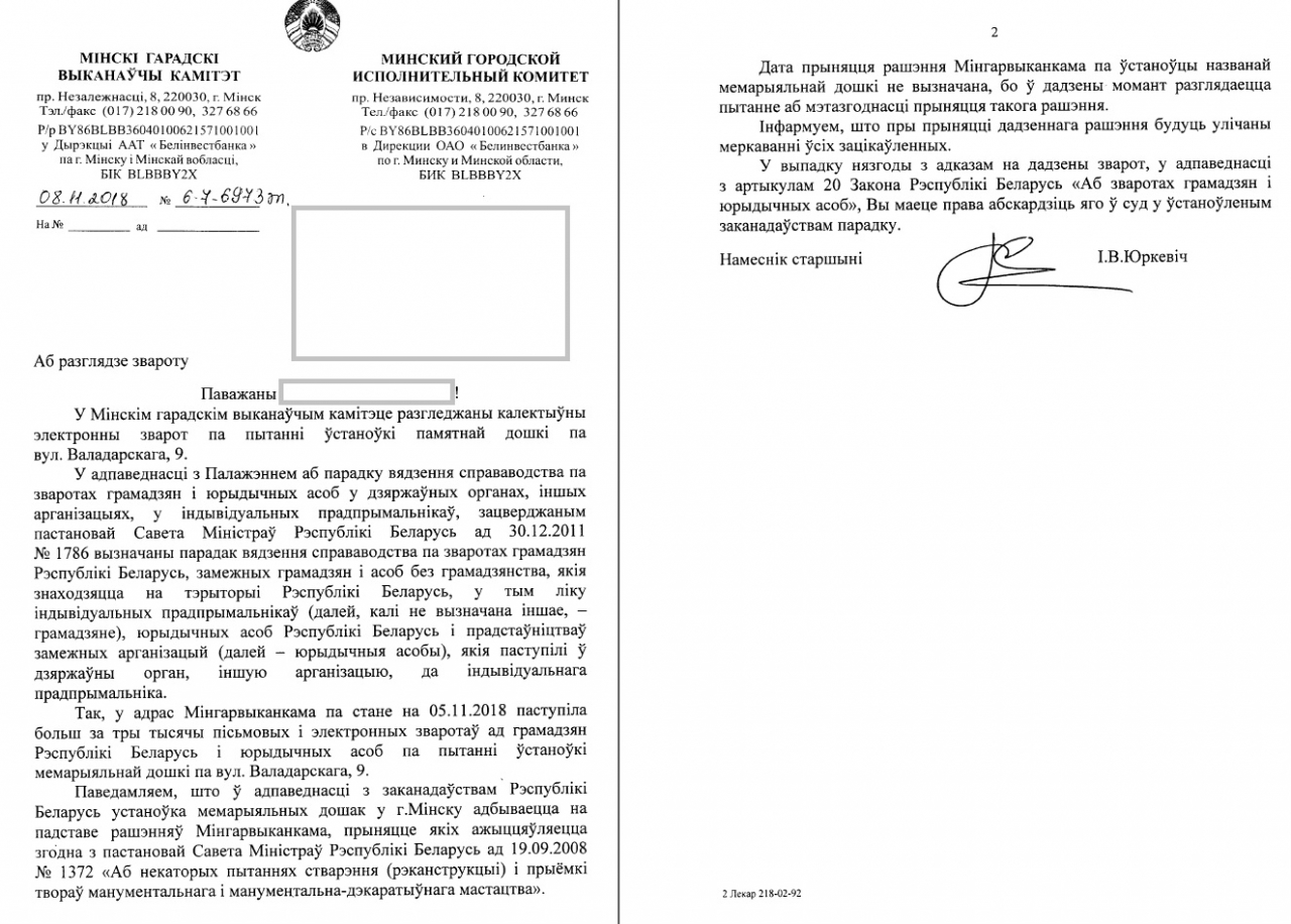 У адказе Мінскага гарвыканкама ёсць сведкi аб разглядзе толькi першага пытання калектыўнага звароту, у прыватнасці адносна просьбы лічыць зварот "голасам" ЗА ўсталяванне шыльды прысвечанай 100-годдзю БНР.