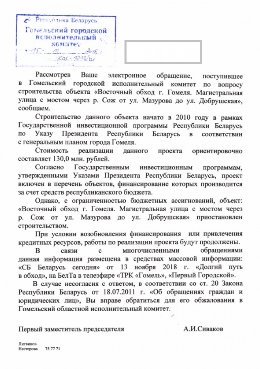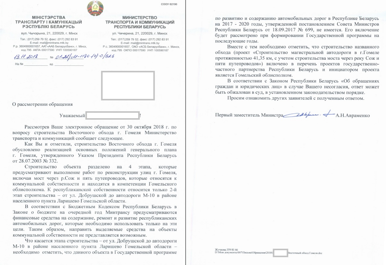 В связи с вышеизложенным мы просим найти финансирование и завершить строительство объекта “Восточный обход” в Гомеле.