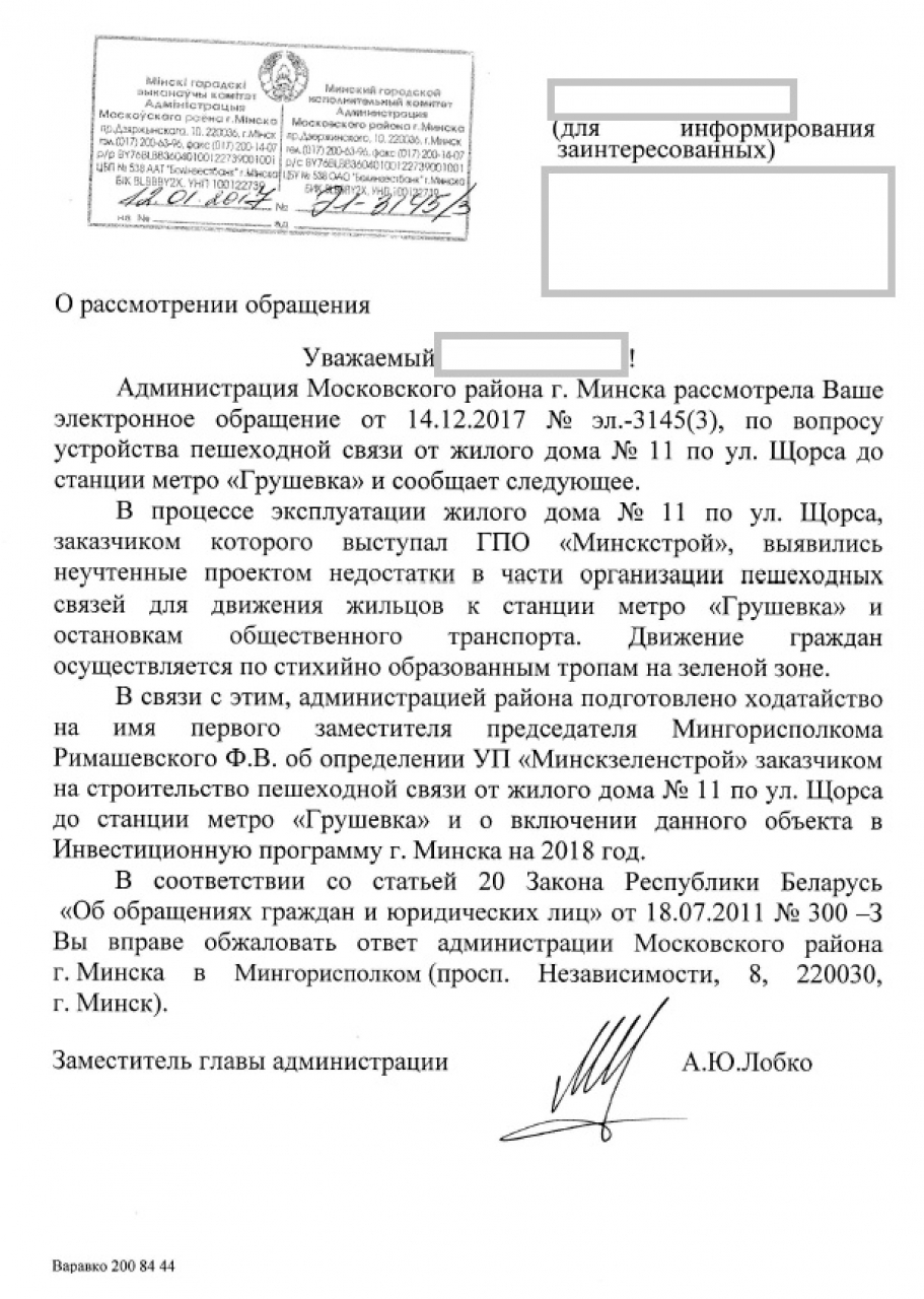 12 января 2018 получен ответ на электронное обращение (копия прилагается). В данном ответе указано, что Администрация Московского района г.Минска выступит с ходатайством на имя первого зам.председателя Мингорисполкома об определении УП "Минскзеленстрой" заказчиком на строительство пешеходной связи возле дома №11 по ул Щорса до ст. метро "Грушевка" и о включении данного объекта в Инвестиционную программу г. Минска на 2018 год.