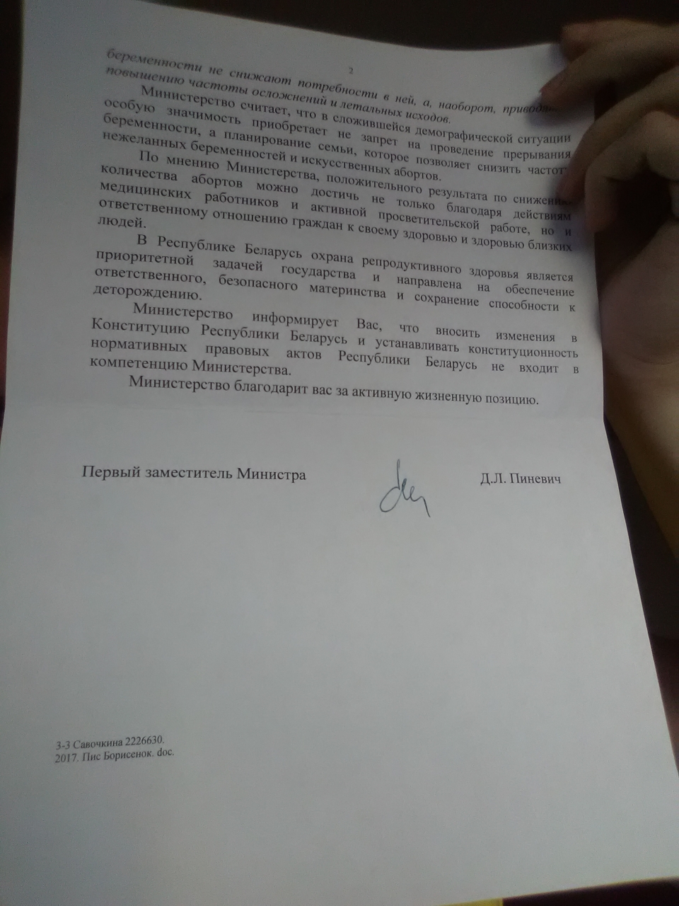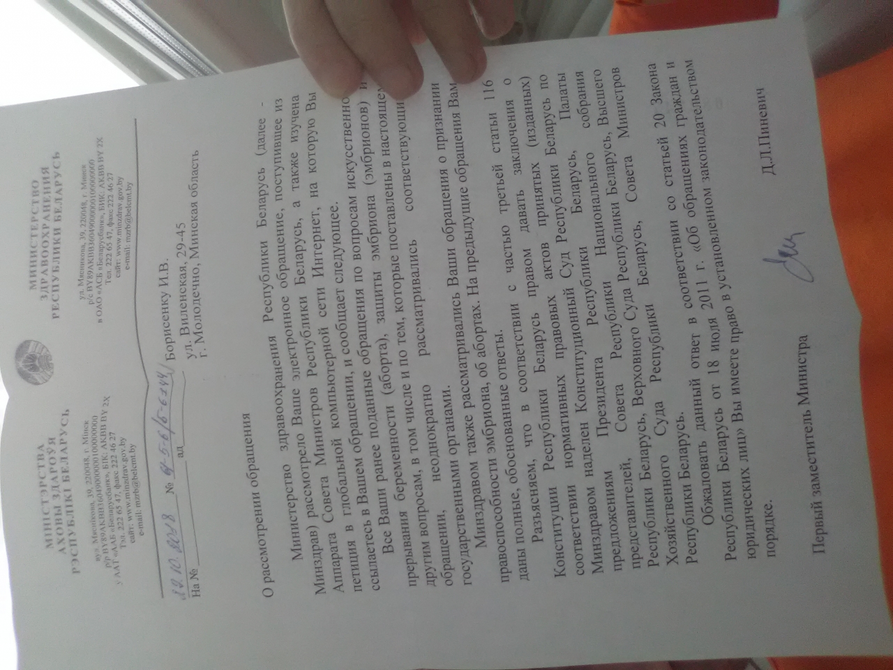 В нарушение законодательства, ответ дан Минздравом, еще до поступления к рассмотрению, не по существу поставленных вопросов, коллективного обращения ( обжалование было в Совете Министров ) - ответ даёт Совет Министров, так как ответы Министерств обжалуются в Совете Министров. Видимо, Минздрав, не разобрался в петиции 1864 Защитить права детей больных родителей, ранее этот вопрос нигде не рассматривался, ( в ответе обман Министерства, такие в Министерствах чиновники ) и вместо Совета Министров, в нарушение законодательства, умудрился дать ответ по петиции 1887 ещё до ее поступления к рассмотрению. В Беларуси возможно, даже, невозможное...