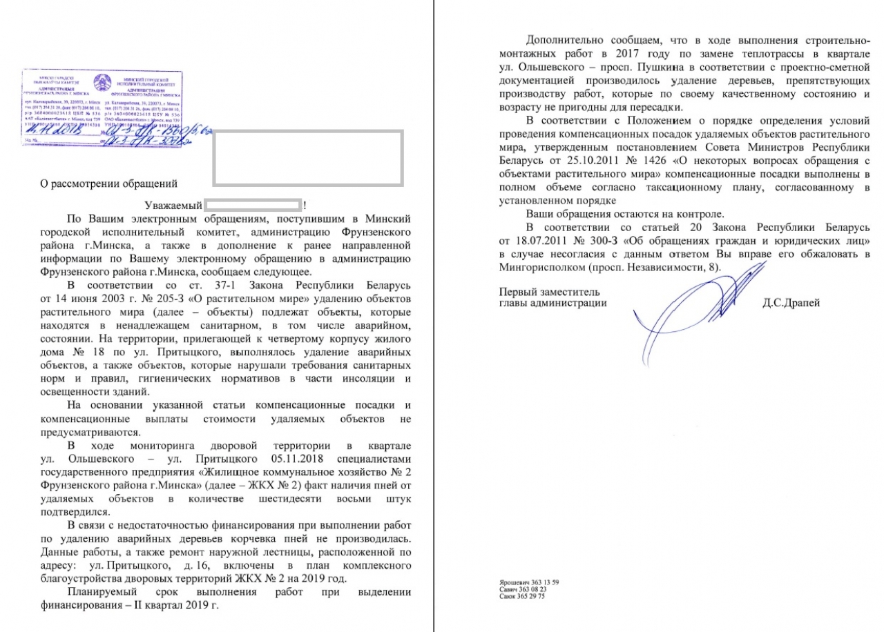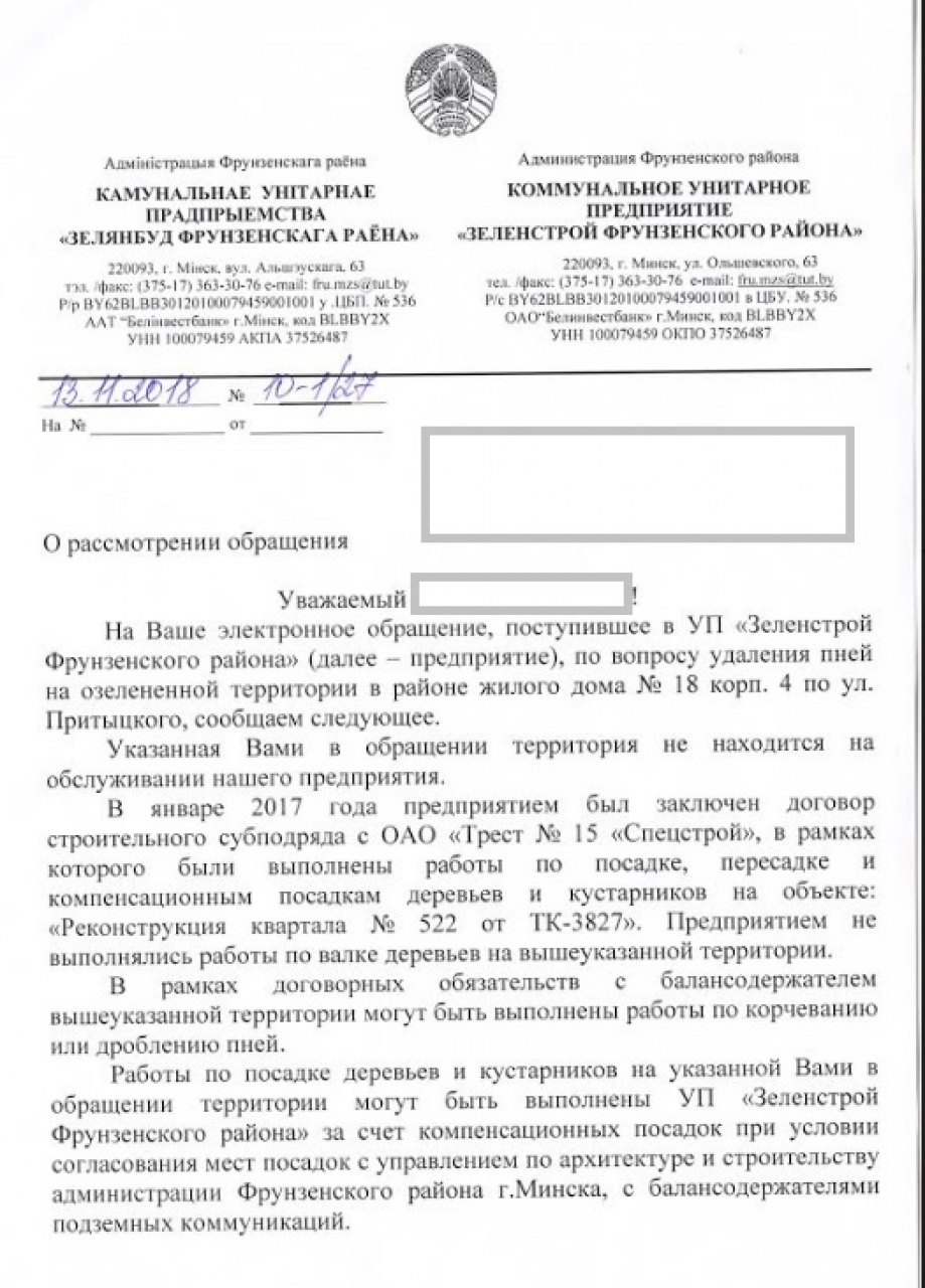 3. Обязать УП "Зеленстрой" Фрунзенского р-на (или иную компетентную организацию) провести работы по выкорчевыванию пней в жилой зоне.