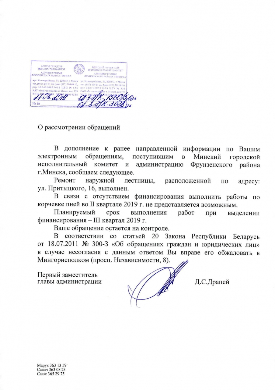 UPD Ремонт наружной лестницы на ул.Притыцкого, 16, выполнен. Работы по корчёвке пней при выделении финансирования планируются в III квартале 2019 г.