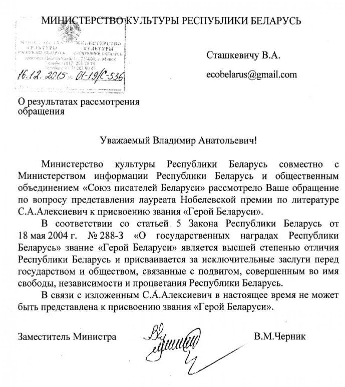 В Законе "О государственных наградах Республики Беларусь" указано, что представление к присвоению звания "Герой Беларуси" может осуществляться по инициативе министерств. В этой связи, подписываясь под настоящим обращением, мы просим Министерство культуры Республики Беларусь представить писательницу Светлану Алексиевич к присвоению звания "Герой Беларуси".