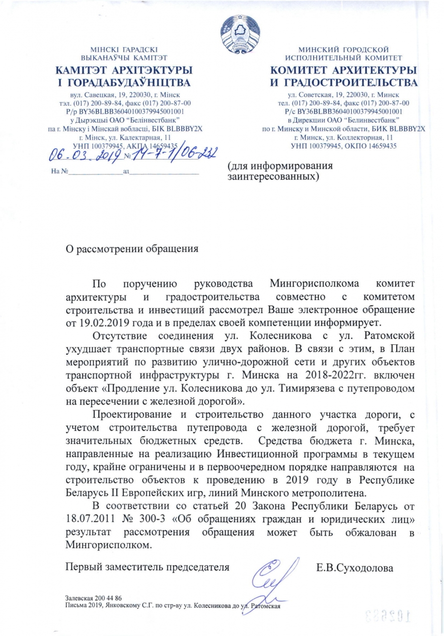 На основании изложенного просим организовать проезд между улицами Ратомской и Колесникова, что позволит значительно улучшить транспортную ситуацию в данном районе, разгрузит улицу Тимирязева в часы пик и поспособствует исправлению экологической ситуации в близлежащем частном секторе.