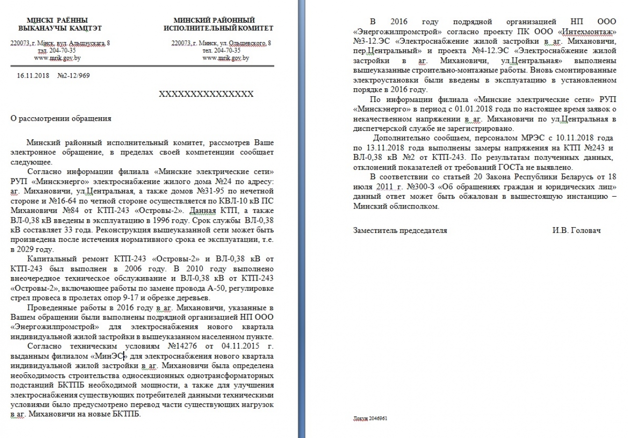 По информации филиала «Минские электрические сети» РУП «Минскэнерго» в период с 01.01.2018 года по настоящее время заявок о некачественном напряжении в аг. Михановичи по ул.Центральная в диспетчерской службе не зарегистрировано.