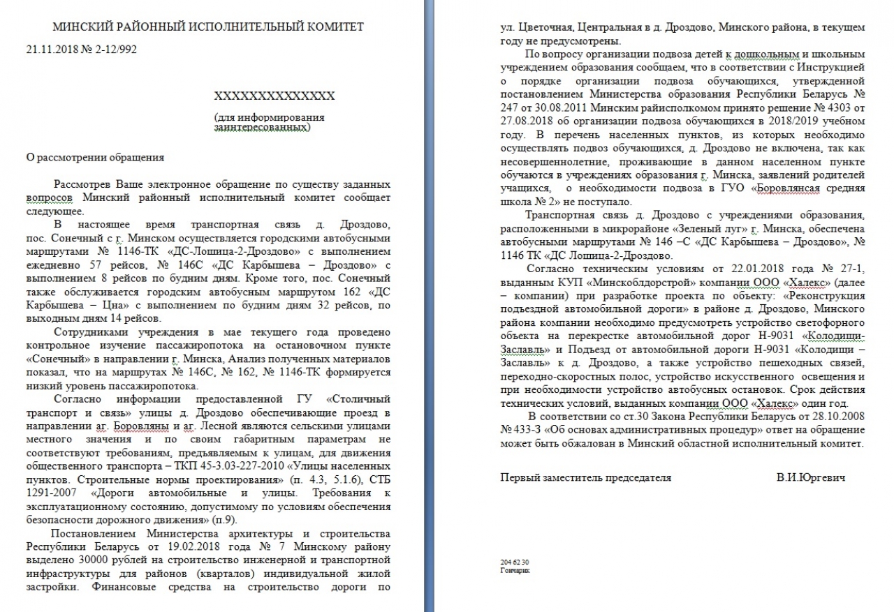 В связи с вышеизложенным, просим предусмотреть в местном бюджете на 2019 год расходы на финансирование работ по приведению дорог деревни Дроздово Минского района в соответствии с нормами с целью решения в дальнейшем вопроса о корректировки маршрута пассажирского транспорта.