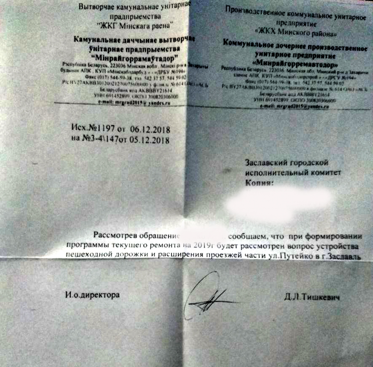 На основании статьи 41 Закона Республики Беларусь «О местном управлении и самоуправлении», которая устанавливает, что исполкомы организуют строительство, реконструкцию, ремонт и содержание местных автомобильных дорог, управляют дорожной деятельностью, организуют работу по благоустройству территорий населенных пунктов, осуществляют составление проекта местного бюджета, просим рассмотреть и выделить (заложить в бюджет 2019 года) финансирование на расширение участка дороги H8979\ улицы Путейко в г.Заславль.