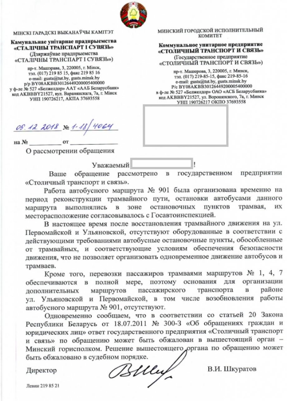 В связи с вышеизложенным, просим принять меры по возобновлению курсирования, автобусного маршрута №901, который должен существовать и далее, во-первых, как "дублёр" трамвайной линии, во-вторых, как маршрут, связывающий ДС "Дружную" и "Комаровский Рынок", а также ул. Козлова, Платонова, Чапаева, Бобрускую и Толстого.