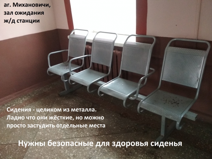 13. Сидения в зале ожидания на станции очень неудобные: они выполнены целиком из стали, включая сидения. При этом зимой в зале ожидания часто поддерживается температура в районе +10С. Данная температура соответствует нормам, но в таких условиях сидеть на металлических сидениях небезопасно для здоровья, есть риск переохладить отдельные части тела. А ведь сесть необходимо именно самым уязвимым группам населения: пожилым людям, беременным женщинам. Просим заменить сидения на более удобные и безопасные для здоровья.
