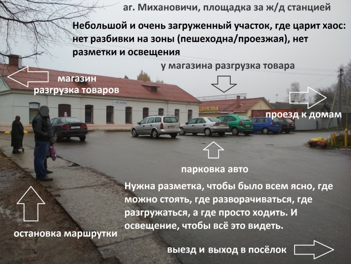 6. За зданием ж/д станции расположен асфальтированный участок, который сегодня используется как попало: тут и парковка, и остановка общественного транспорта и разгрузочная площадка для магазинов. Из-за отсутствия разметки и чёткого разделения на зоны, автомобили паркуются нерационально, часто отсутствует место для разворота транспорта и перемещения пешеходов и колясок. Кроме того, отсутствует освещение, что повышает криминогенность обстановки. Необходимо нанести разметку, разделить участок на зоны, предусмотреть освещение.