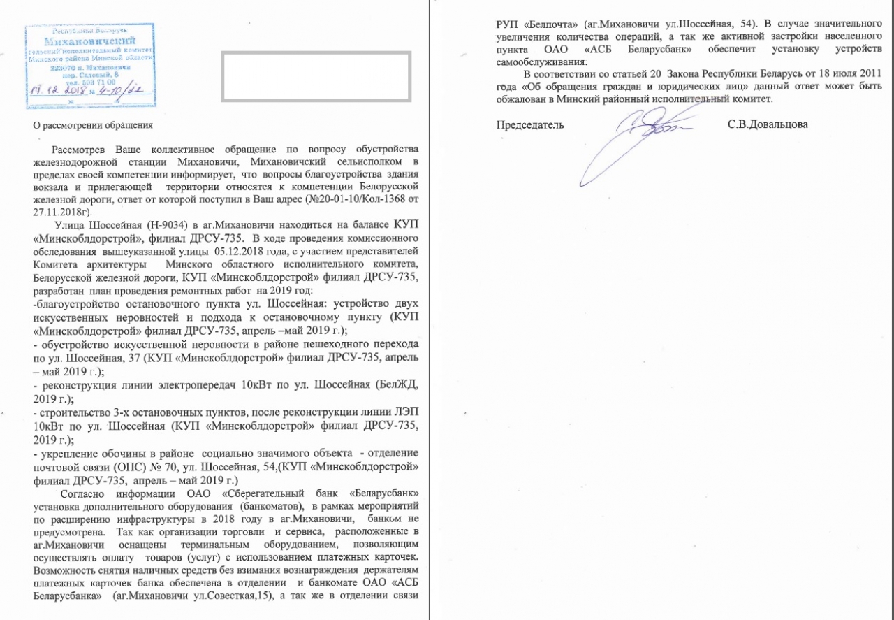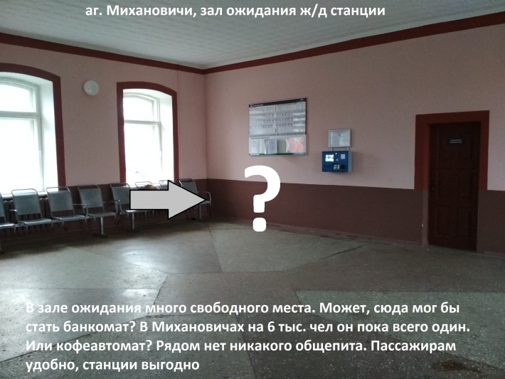 11. В аг. Михановили на 6 тысяч человек есть всего один банкомат, и расположен он неудобно. Просим руководство железнодорожной станции рассмотреть возможность выделения площади под установку банкомата. Места в зале ожидания достаточно, а предложения банков ввиду описанного выше положения, надеемся, поступят. Мы полагаем, в такой ситуации руководство станции может получить выгоду от сотрудничество с банком, а пассажиры получат банкомат, расположенный в главном транспортном узле агрогородка.
