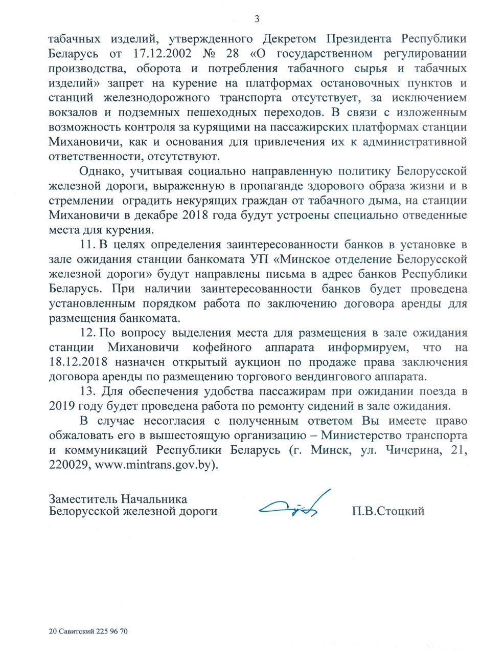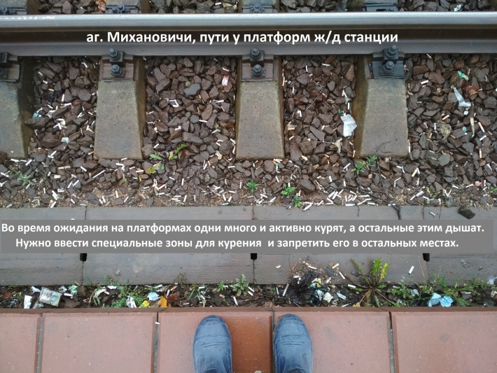 10. На платформах станции аг. Михановичи нет никакого действенного ограничения курения. Ожидающие поезд пассажиры-курильщики курят прямо на платформе, и этим вынуждены дышать остальные. Но уйти некуда: курящие равномерно распределены по платформе, и либо терпи, либо не садись на поезд. Об этой традиции лучше всего свидетельствуют плотная россыпь окурков на путях. Необходимо выделить специальные зоны для курения, от которых некурящие люди будут иметь возможность просто отойти. Устройство зон должно идти совместно с доступной информацией о запрете курения в иных местах и, при необходимости, со штрафами за нарушения.