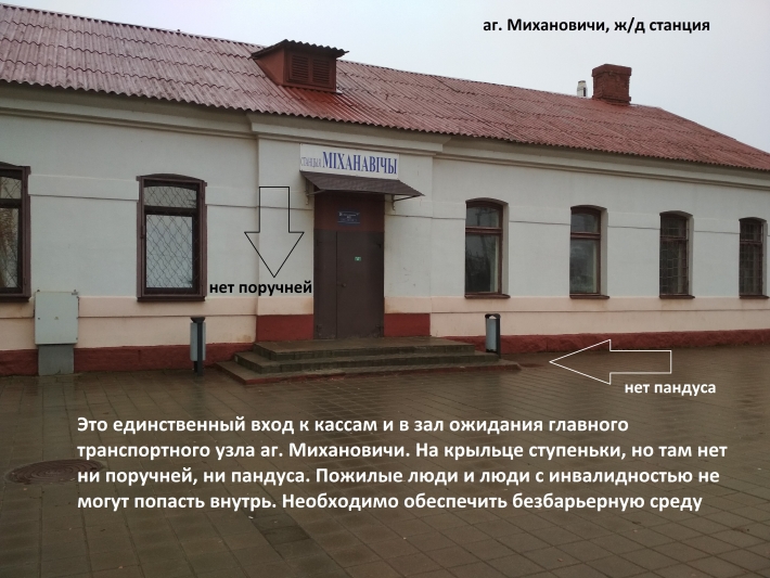 В аг. Михановичи функционирует центр дневного пребывания инвалидов. Кроме того, уже ведутся подготовительные работы по строительству физкультурно-оздоровительного комплекса для подготовки паралимпийцев. А это значит, что создание безбарьерной среды на таком важном для агрогородка объекте, как железнодорожная станция, больше не может откладываться. Cогласно ст. 26 закона РБ "О социальной защите инвалидов в Республике Беларусь", действующие объекты социальной инфраструктуры должны быть приспособлены для доступа и использования инвалидами. Поэтому многие вопросы данного обращения касаются безбарьерной среды.