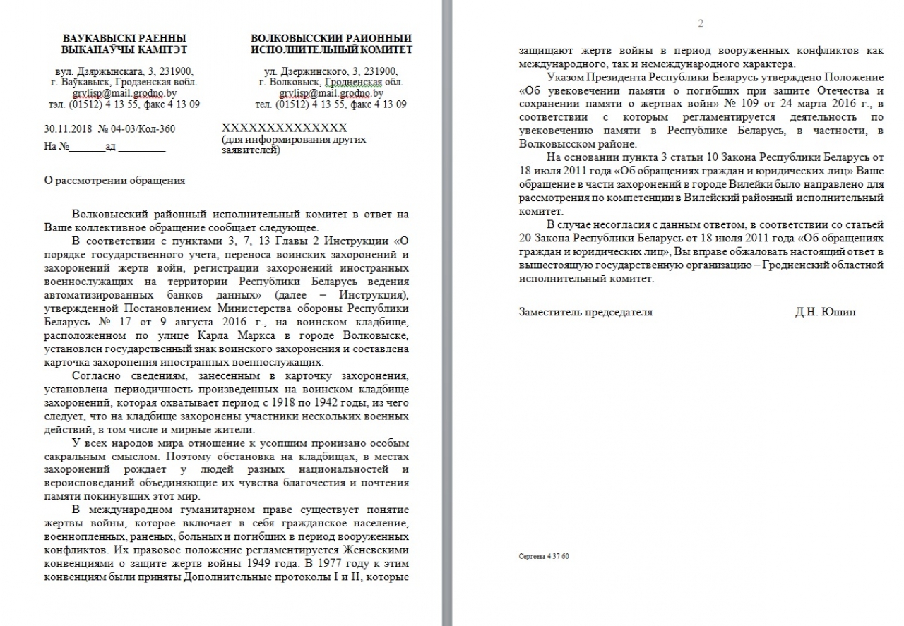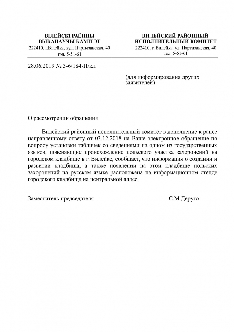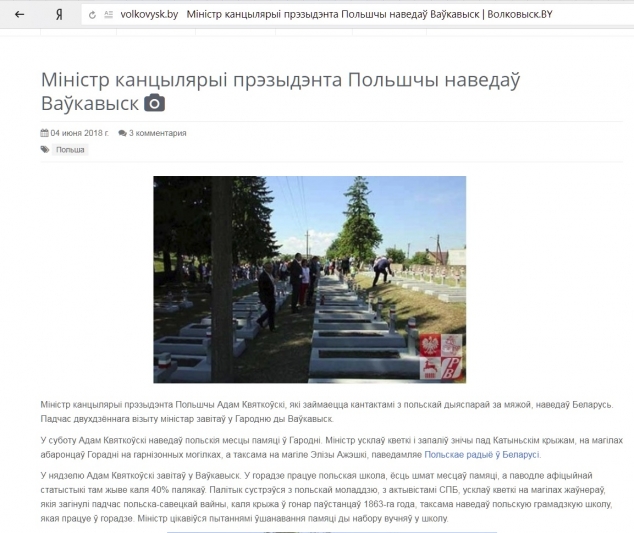 Также считаю необходимым дополнительно сообщить , что после моего запроса в Волковыский райисполком о происхождении памятника, буквально через две недели в Волковыск приехал глава канцелярии президента Польши проверять состояние монумента, находящегося в Волковыске. Была ли информирована польская сторона представителями райисполкома о моем запросе, я не могу знать.