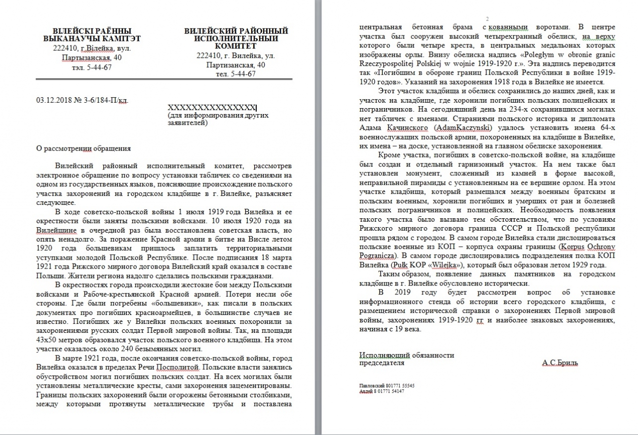 Прошу установить таблички со сведениями на одном из государственных языков, поясняющими основания и происхождение мест захоронений в Волковыске - Монумент на Мемориальном кладбище польских солдат) и в Вилейке - Памятник польским солдатам.