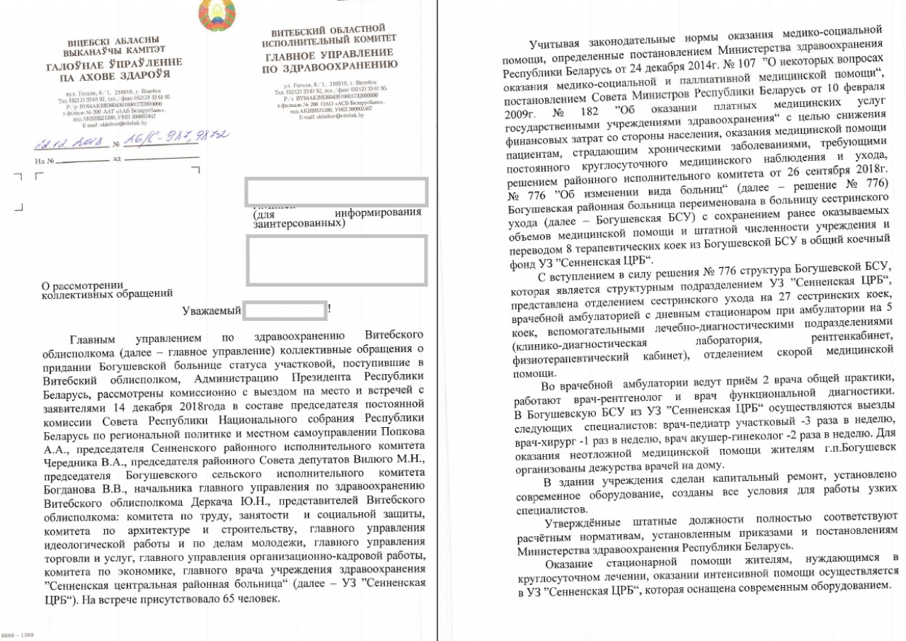 Со слов Чередника В.А. и Мизавцова И.М., а позже из государственных газет мы узнали, что принято решение о переводе Богушевской районной больницы в статус больницы сестринского ухода, а поликлиники – в статус амбулатории. Представители местной власти заявили, что у района нет средств на сохранение медучреждений в прежнем виде. Нам также сообщили, что в связи с изменением статуса в больнице 27 медико-социальных коек станут койками сестринского ухода, а 8 терапевтических коек превратятся в 5 коек дневного пребывания при амбулатории, и что стационарное лечение и обследование жители Богушевска и окрестных деревень будут получать в Центральной районной больнице в Сенно. Туда же планируют передать и единственную машину скорой помощи. Нам пытаются объяснить, что от этого мы только выиграем.