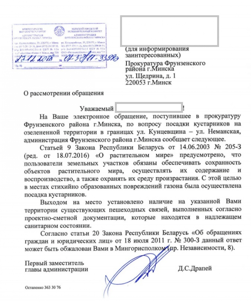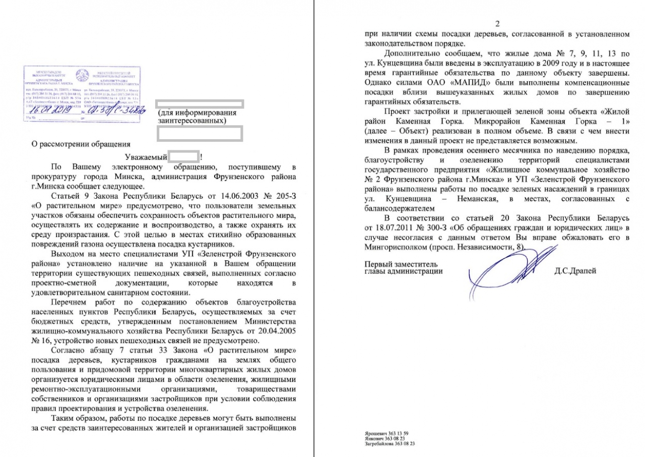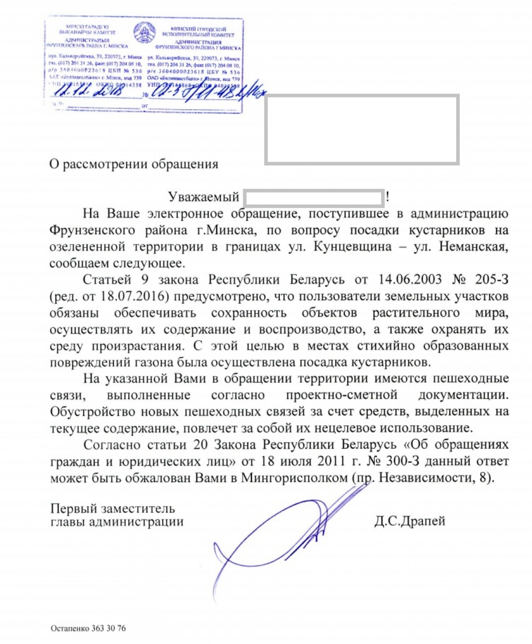 На основании статьи 41 Закона Республики Беларусь «О местном управлении и самоуправлении», которая устанавливает, что исполкомы организуют работу по благоустройству, озеленению территорий населенных пунктов, просим: