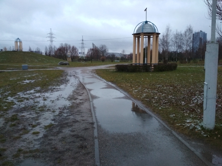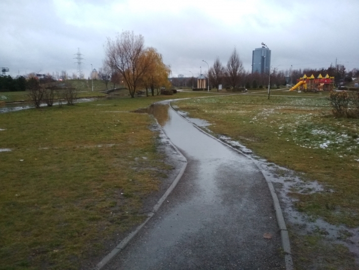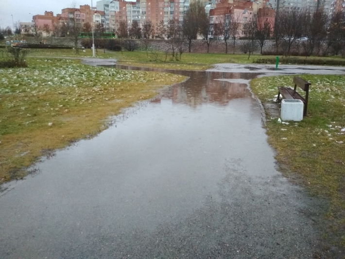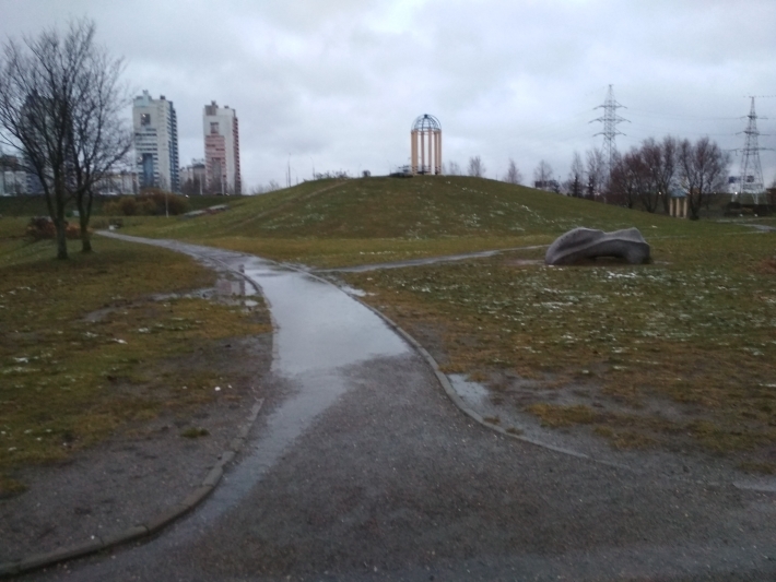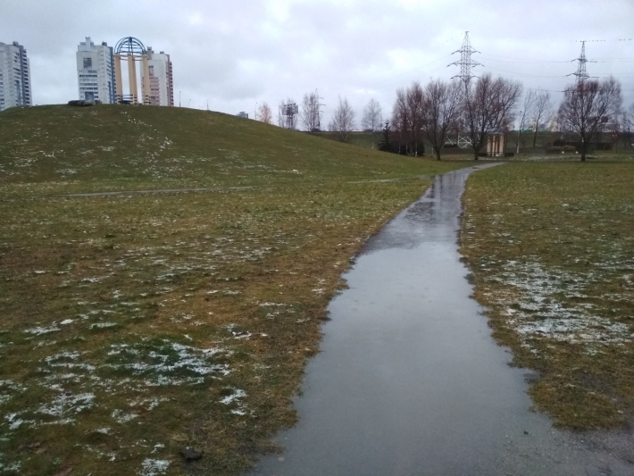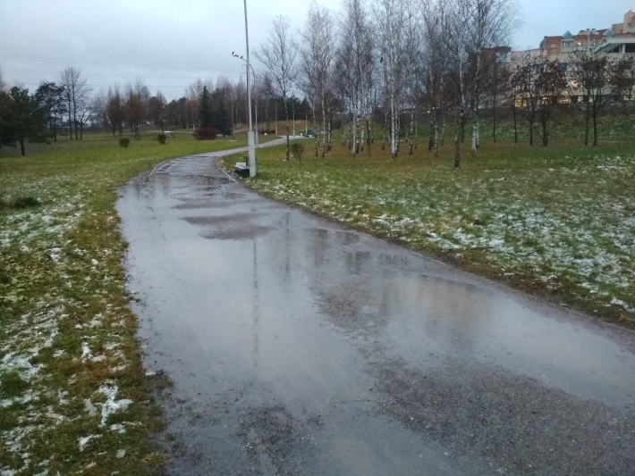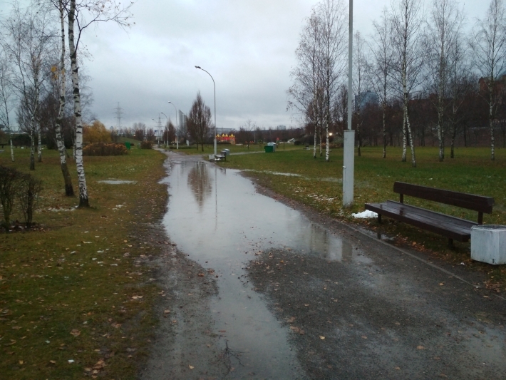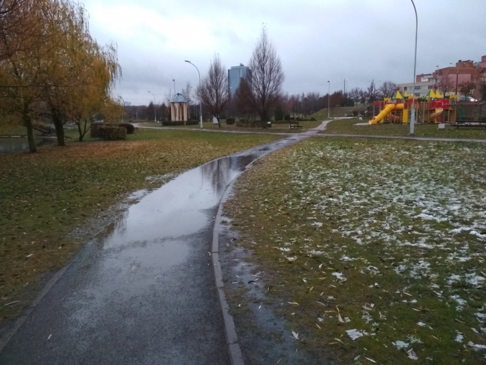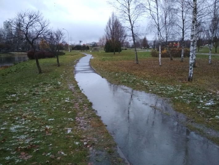 В парке "Уручье" в г. Минске на пешеходных дорожках есть очень много мест, где не решён отвод воды. После дождя десятки метров дорожек стоят под слоем воды в 5-10 см, пройти с сухими ногами невозможно. В итоге парк становится просто недоступен для посетителей.
