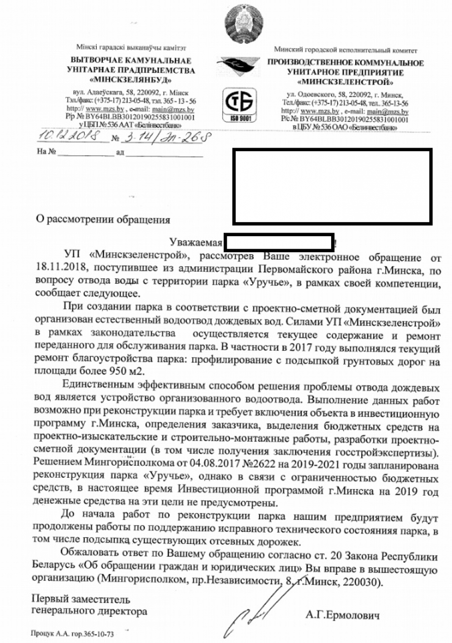 принять меры, направленные на обследование территории парка "Уручье" с целью выявления участков дорожек, где не осуществлён отвод воды, а также на выполнение работ по устранению вышеописанных проблем;