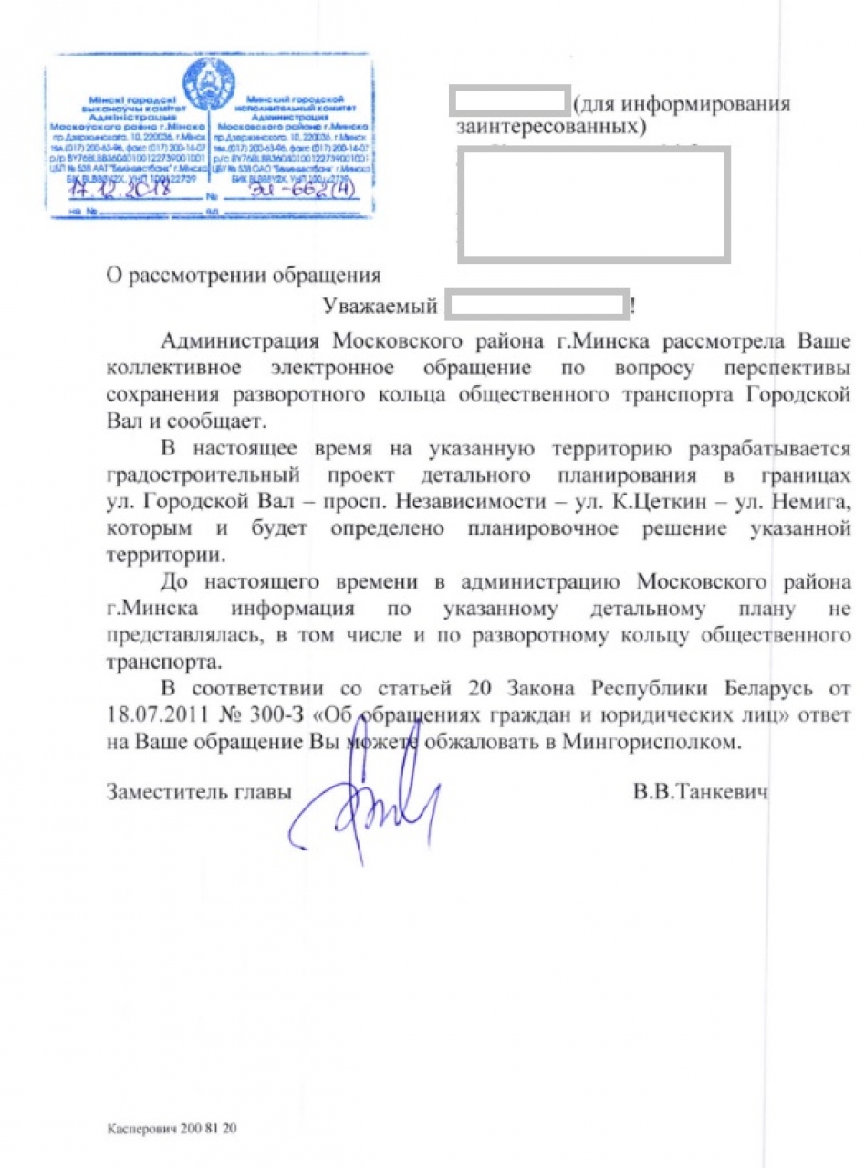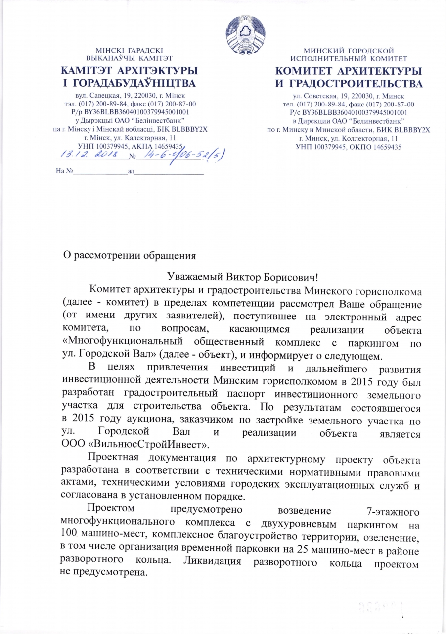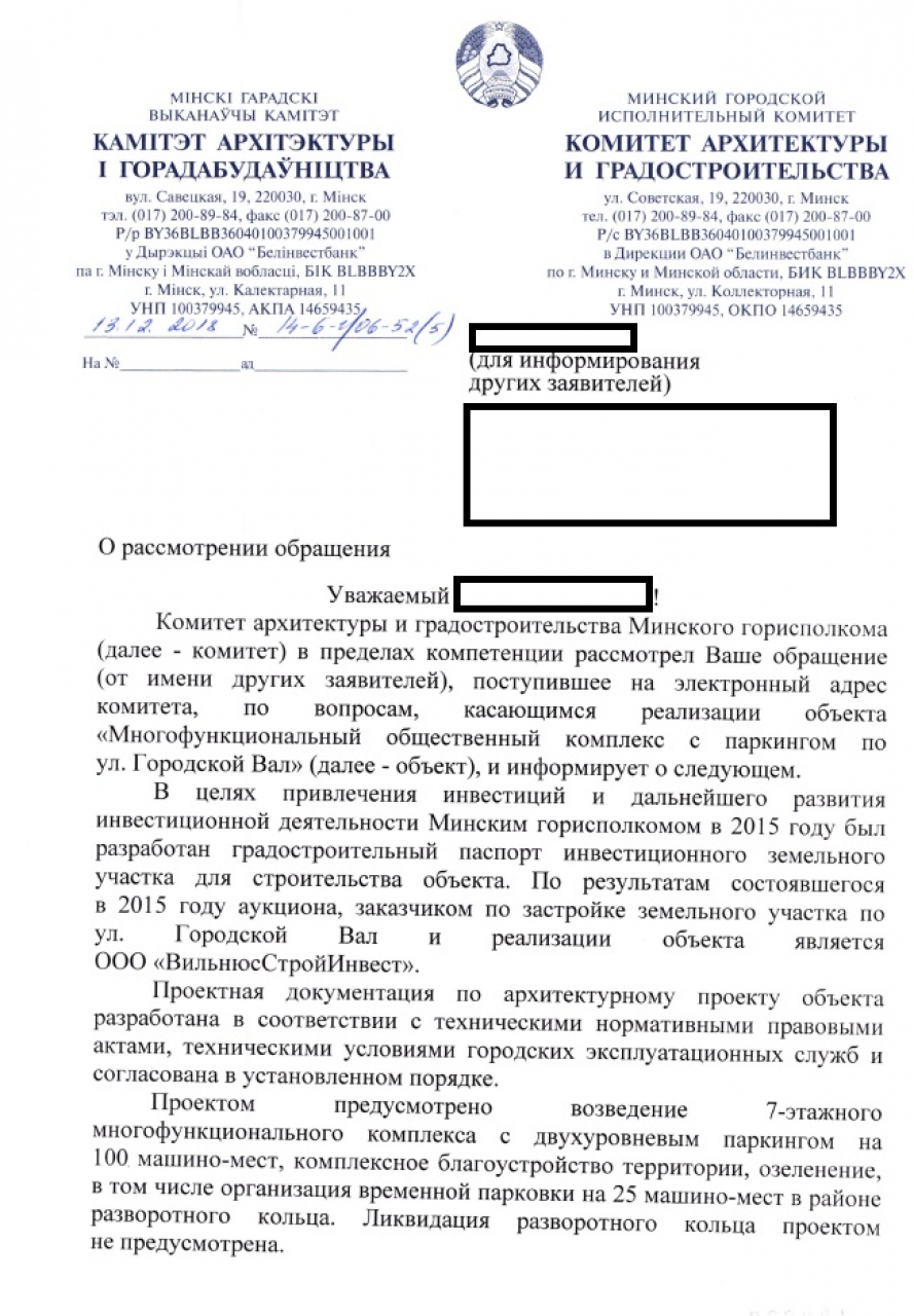 пересмотреть проект строительства, предложенный ООО «ВильнюсСтройИнвест», и отклонить его в части строительства парковки на месте разворотного кольца на Городском вале, так как непродуманное уничтожение данного кольца приведёт к транспортному коллапсу в этой части города и серьёзным транспортным перегрузкам.