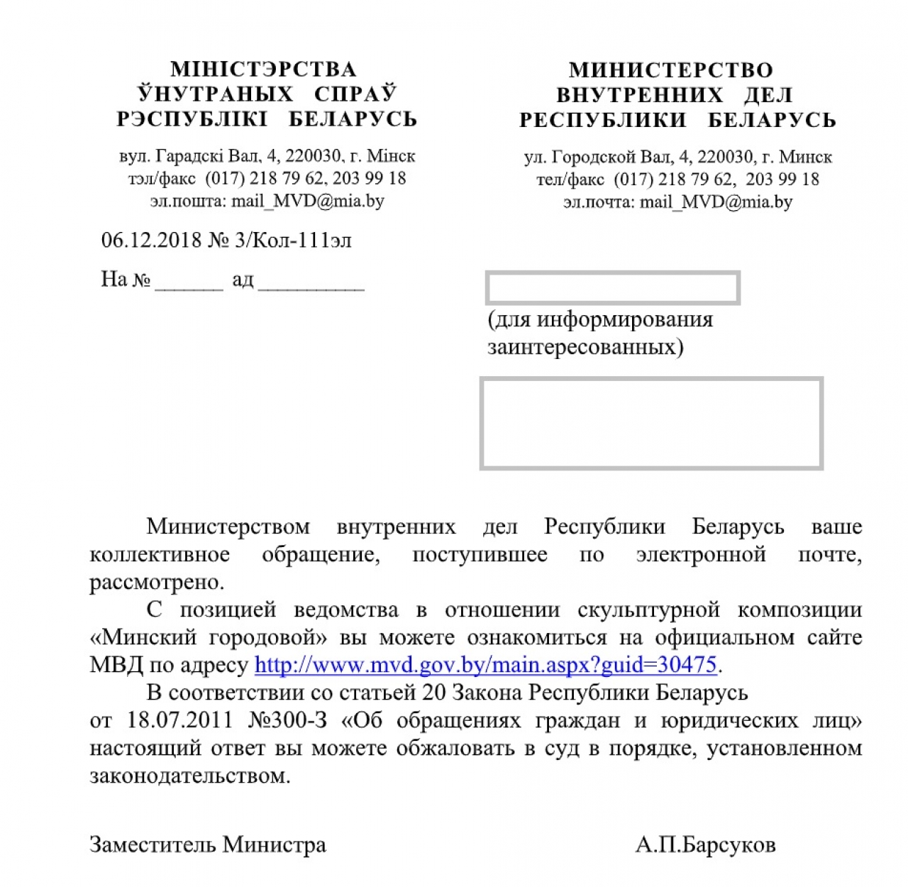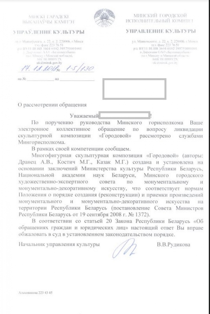 Появившаяся в нашем городе скульптура царского городового несколько раз становилась предметом агрессии жителей Минска. Хоть до настоящего вандализма в отношении этого малохудожественного произведения дело не дошло, тем не менее она несомненно является будоражащим общественное сознание фактором. Беспрецедентные действия сотрудников внутренних дел, заставивших несовершеннолетнего гражданина под угрозой возбуждения административного преследования за, якобы, хулиганство, извиняться перед истуканом (!) подтверждают необходимость избавиться от скульптуры, как от фактора, нарушающего общественное спокойствие. Способ защиты малохудожественного произведения, избранный сотрудниками милиции, провоцирует жителей города-героя Минска на дальнейшие агрессивные действия в отношении металлического истукана. Поэтому наиболее простым способом устранения раздражителя общественного мнения и сохранения спокойствия граждан, по нашему мнению, будет ликвидация малоценной в художественном смысле скульптуры городового.