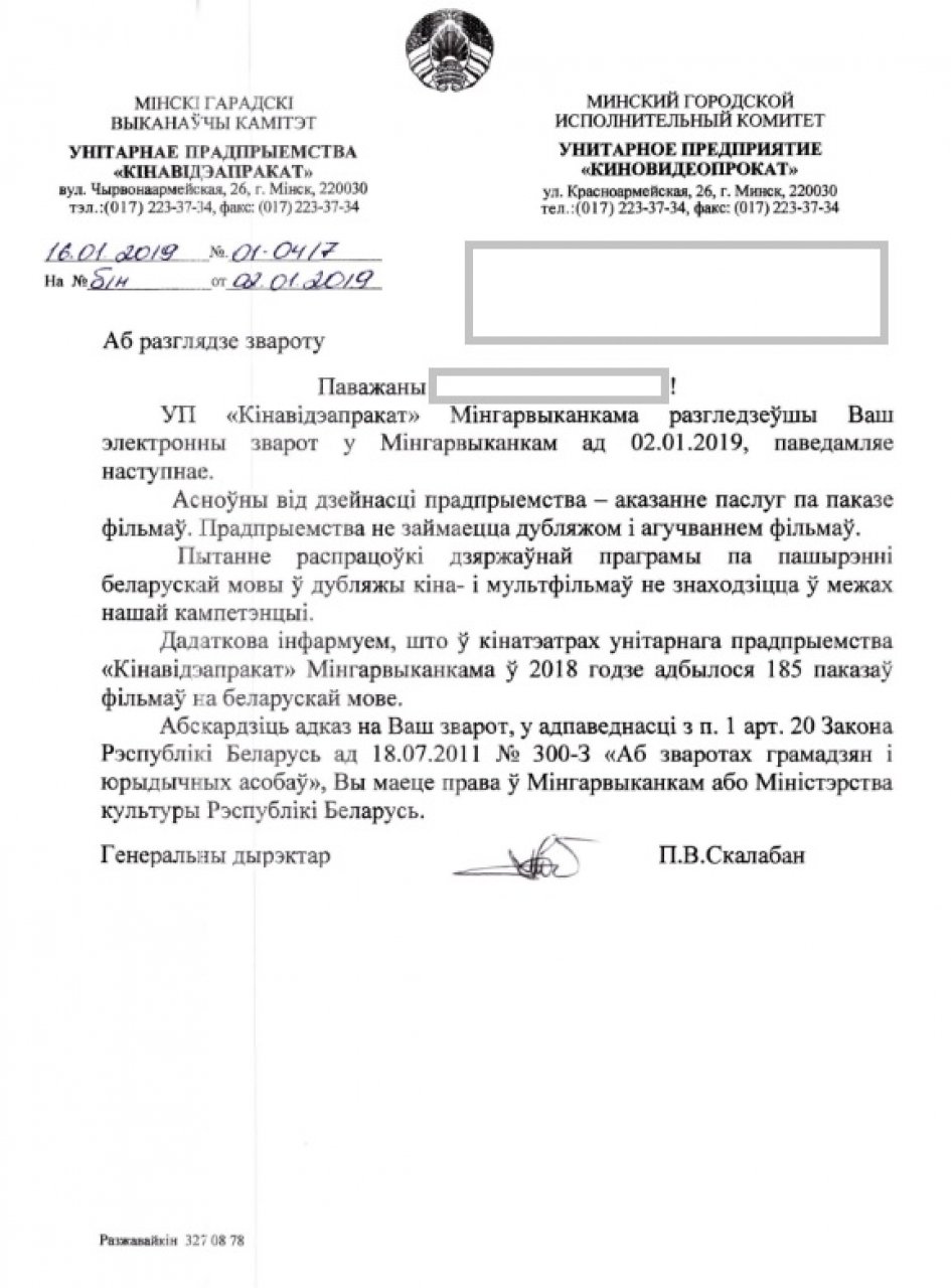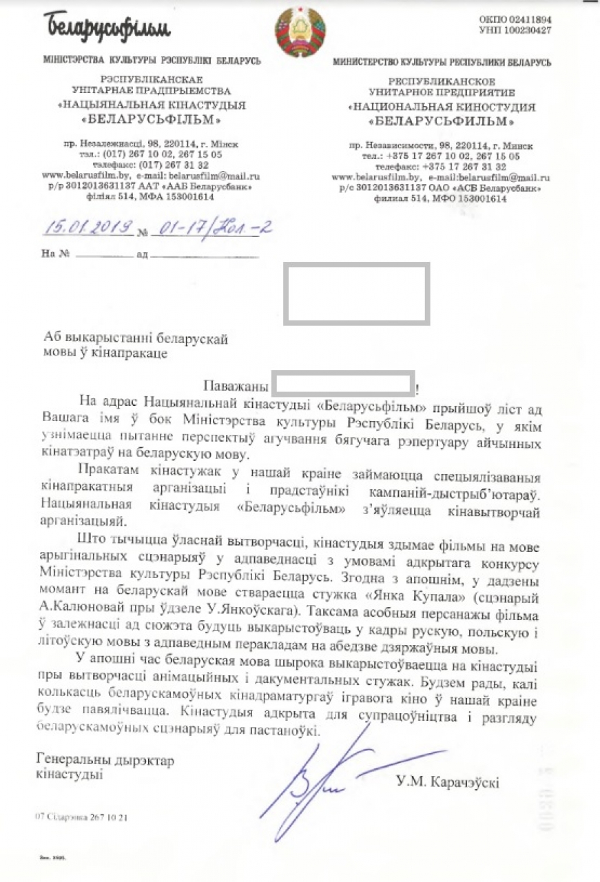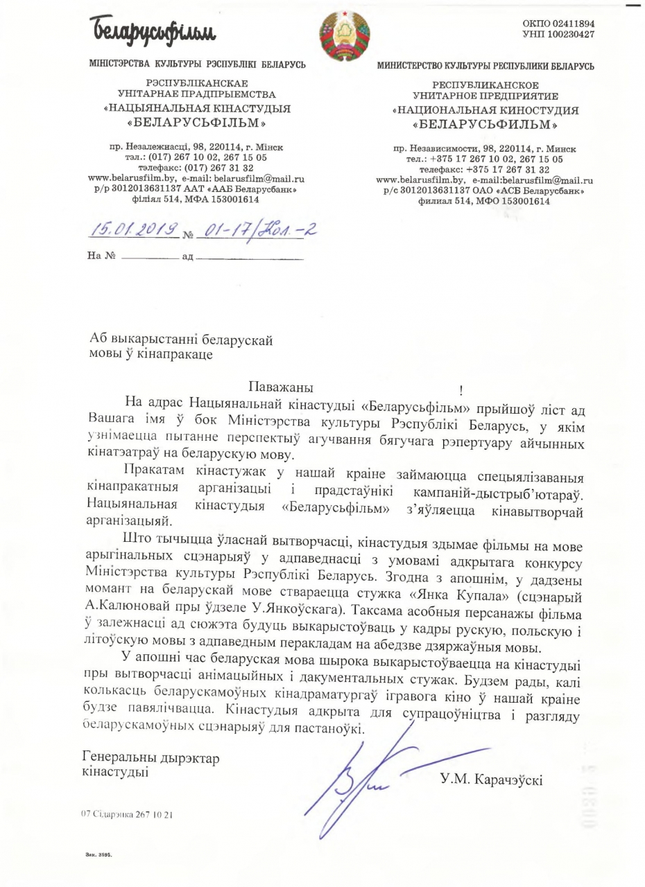 Нацыянальная кiнастудыя "Беларусьфiльм" не займаецца агучваннем бягучага рэпертуару айчынных кiнатэатраў, але выкарыстоўвае беларускую мову пры вытворчасцi стужак.