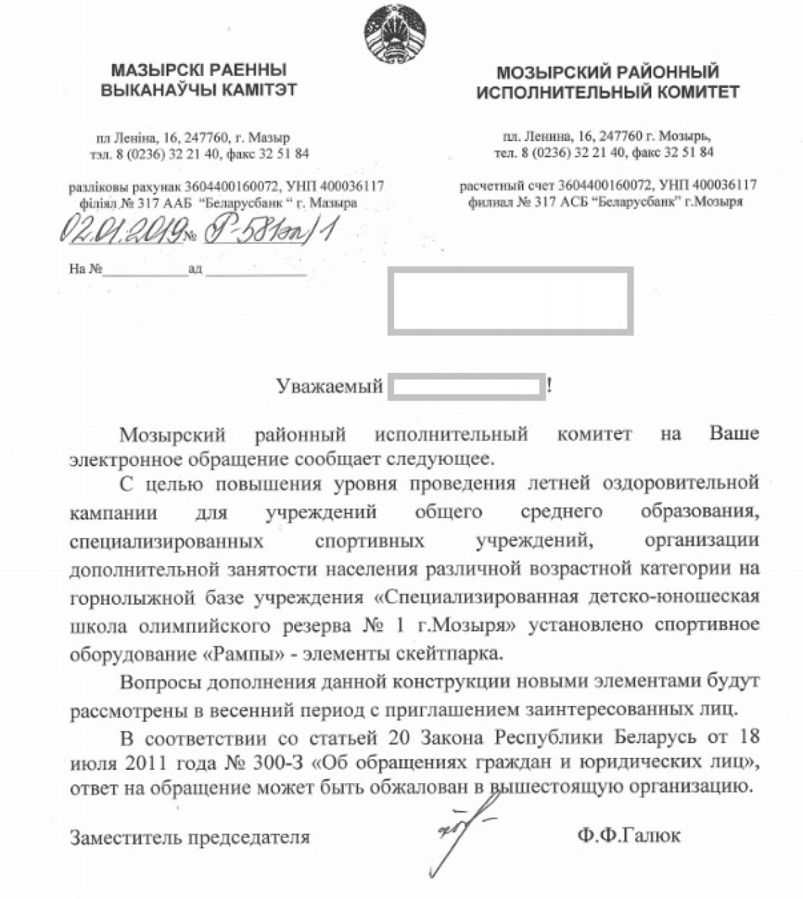 Здравствуйте. Мы - молодежная инициативная группа г.Мозыря и иные неравнодушные граждане, хотели бы обратить ваше внимание на проблему отсутствия специализированной площадки для занятия скейтбордом и другими экстремальными видами спорта в Мозыре. В нашем городе такие виды спорта как ролики (Aggressive In-Line), скейтбординг, экстремальный самокат, MTB и BMX из года в год активно набирают популярность среди молодежи.