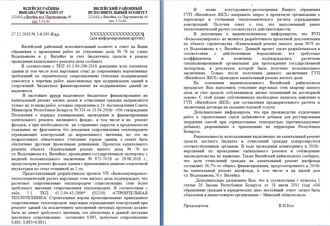 Верность проведенных расчетов вызывает сомнения, ведь не могут коэффициенты теплового сопротивления домов № 76 и № 78 по ул. Водопьянова, абсолютно идентичных, построенных в одно и тоже время, из одного и того же материала, по типовым проектам и, более того, специалистами одной и той же организации, различаться настолько, чтобы в одном доме утеплять стены нужно было, а в другом, находящимся в 10-15 метрах, не нужно! Согласно постановления Совета Министров Республики Беларусь от 21.04.2016 № 324 «Об утверждении положения о порядке планирования, проведение и финансирования капитального ремонта жилищного фонда» капитальный ремонт включает в себя в числе прочего и «ремонт фасадов с устранением сырости и продуваемости их фрагментов». КУП «Вилейское ЖКХ» в нарушение законодательства Республики Беларусь о капитальном ремонте жилищного фонда, игнорируя нормы строительной теплотехники, ссылаясь на проект реконструкции дома, выполненный УП «Белкоммунпроект», отказывается проводить утепление стен нашего дома, что позволяет нам прийти к выводу о нерациональном использовании средств местного бюджета, выделенных для проведения капитального ремонта, и средств, накопленных за счет отчислений на капитальный ремонт.