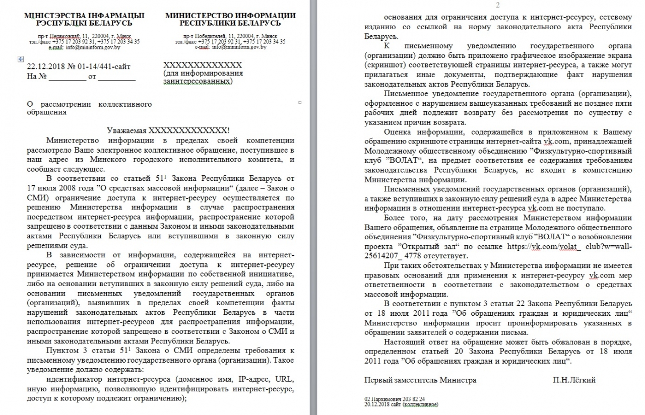 10 ноября 2018 года на странице Молодежного общественного объединения «Физкультурно-спортивный клуб «ВОЛАТ» (зарегистрировано Главным управлением юстиции Мингорисполкома в августе 2012 года) в социальной сети ВКонтакте (ссылка - https://vk.com/volat_club?w=wall-25614207_4778) было размещено объявление о возобновлении проекта «Открытый зал» (скриншот см. ниже).