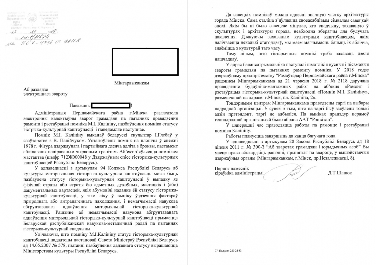 2. Спынiць рэстаўрацыю помнiка Калiнiну.