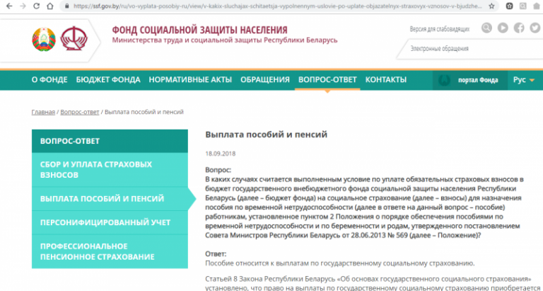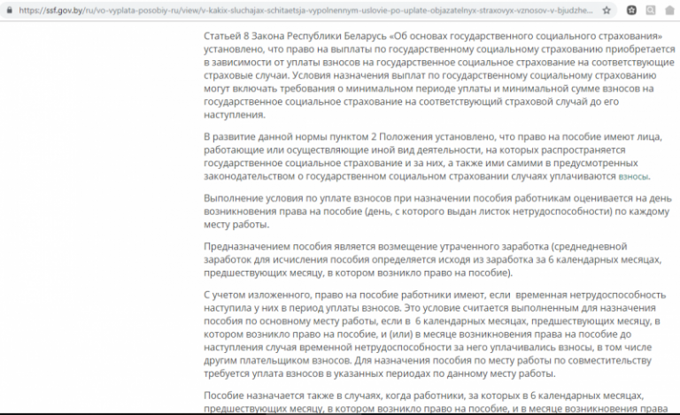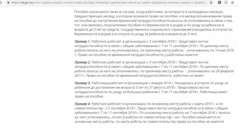 На сайте ФСЗН (ssf.gov.by/ru/vo-vyplata-posobiy-ru/page/3/) в рубрике «вопрос-ответ» 18.09.2018 размещено разъяснение о праве застрахованного лица на пособие (по временной нетрудоспособности, по беременности и родам) в зависимости от перечисления взносов.