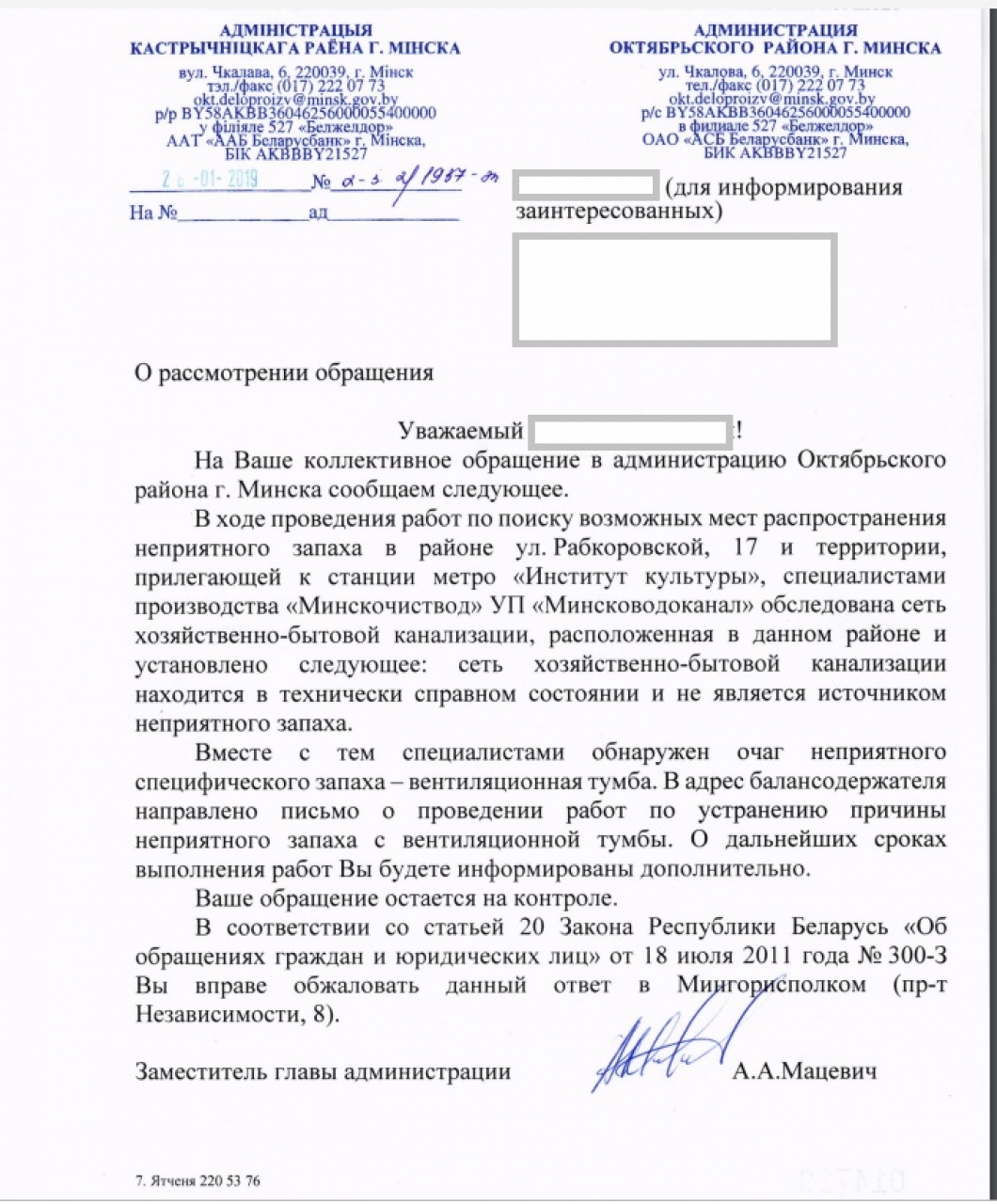 Канализация обследована, она не является источником запаха. Его причина - вентиляционная тумба. Балансодержателю поручено принять меры.